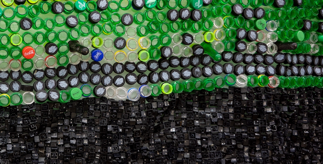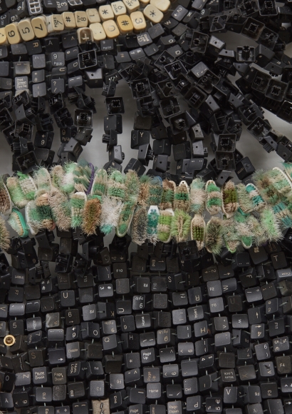 Tappi, coperchi, tubetti del dentifricio, spazzolini da denti, anelli e ogni parte di oggetti dalla vita più che effimera – nell’ottica del monouso – entrano a far parte di composizioni elaborate che richiamano la tradizione artigianale. Ogni pezzo, ogni infinitesimale rifiuto, recuperato da immense montagne nelle discariche, è portatore di una storia, di una responsabilità, spesso raccontata da un nome stampato, da un marchio, da una provenienza, che si oppone alla narrazione occidentale di un continente africano “miniera inesauribile di materie di valore”.