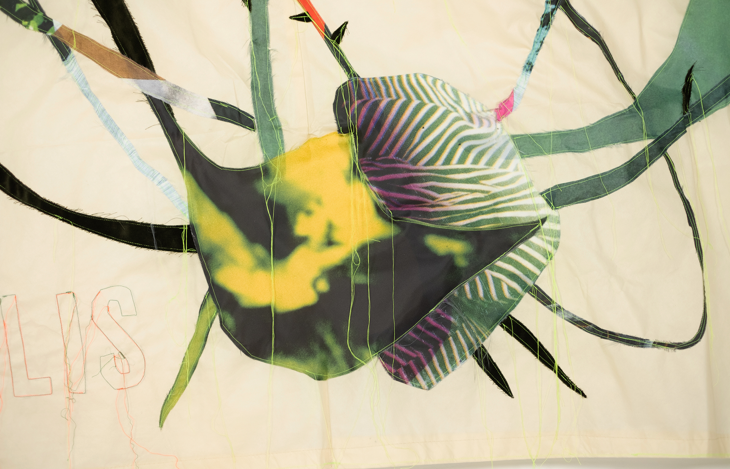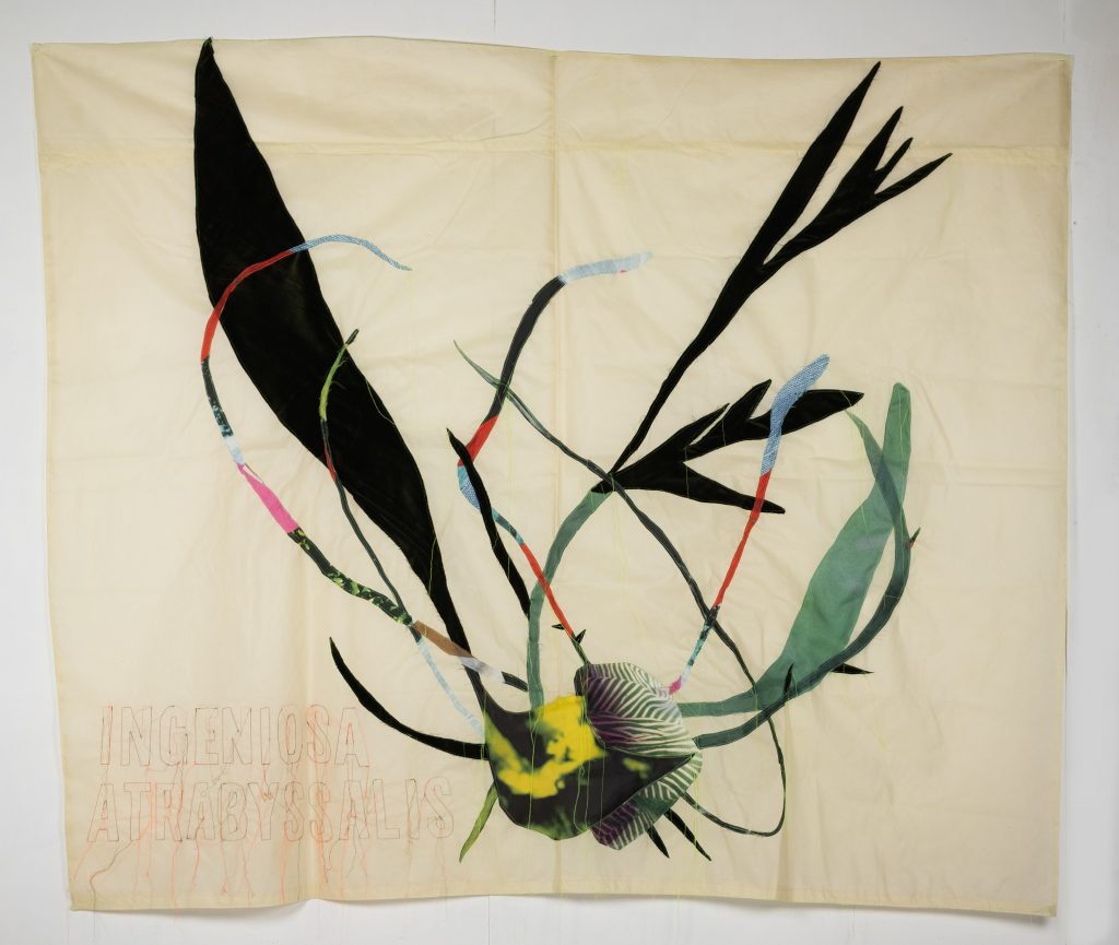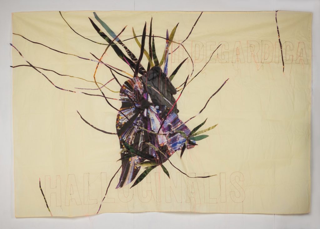 Da sola nel bosco è la mostra alla D3082 dell’artista Lucia Veronesi e curata da Eva Comuzzi, davanti alle quattro vetrine dello spazio in Domus Civica abbiamo quattro giganti tele cucite che raccontano quattro figure femminili della storia: Hildegarda von Bingen, Jeanne Baret, Marianne North e Elizabeth Blackwell. Queste donne apparentemente non collegate hanno un destino comune: in epoche completamente diverse, hanno provato a superare il potere patriarcale del loro tempo, l’artista per rappresentare al meglio le vite di queste donne così coraggiose, ha trasformato le carte sulle quali venivano disegnate piante e fiori in grandi teli in tessuto non tessuto, gli stessi che per chi non lo sapesse vengono usati per proteggere in genere le piante ed i fiori dal freddo dell’inverno. I volti delle quattro vengono riscritte dall’artista in piante e fiori di specie da lei inventate come il nome che portano, che si collegano così alla visionarietà di queste donne, esponendole in tutta la loro essenza, non è facile all’inizio capire questo passaggio, ma ci sono cose che nell’arte hanno bisogno di tempo, proprio come nel mondo vegetale no?