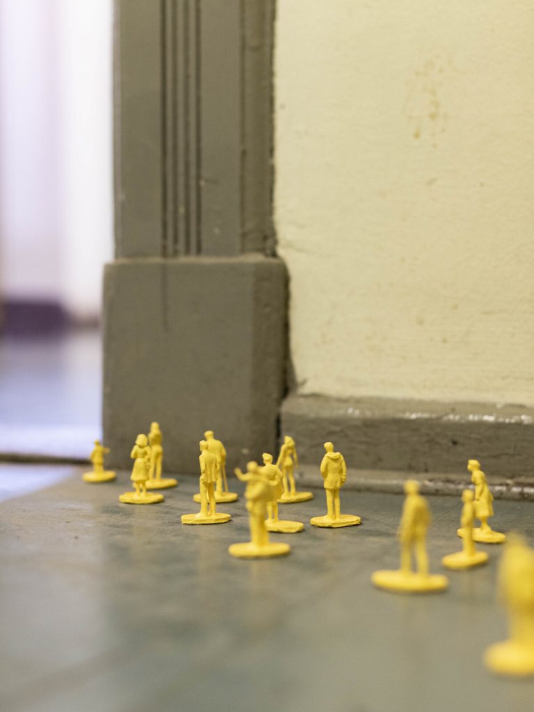 Rinvenendo questa storia dalle fondamenta dell’edificio, l’artista Anna Scalfi ne rende omaggio riposizionandola nel presente-politico contemporaneo, dove il mercato finanziario moderno è il nuovo campo di battaglia comune. Attraversando la tempesta di volantini rossi di Die Komödie! e le installazioni nelle stanze attigue, l’artista propone una messa in scena del consumismo odierno seguita da materiali d’archivio sulla figura di Liebknecht fruiti attraverso le mura e il pavimento dell’edificio; fino a imbattersi in un imponente scritta rossa fuori dalla finestra che dichiara a gran voce COMUNISTA.