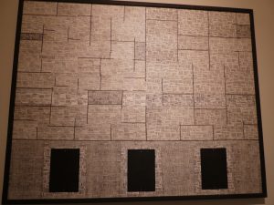 Abdoulaye Ka ha iniziato come pittore figurativo, adesso alterna l’astrazione e la figurazione. Ha trovato qualche anno fa un tema centrale nei codici a barre, che ritaglia e con cui compone i suoi quadri-collage. Il codice a barre ha una strana somiglianza con l’abbigliamento femminile dei Wolof, composto di linee. Per lui il codice a barre e la sua identità numerica è un modo di parlare dell’unicità dell’identità, attraverso un elemento caratterizzante che definisce in modo inequivocabile una singolarità. Il riferimento da individuale si fa plurale nel recupero culturale e senghoriano del radicamento dell’albero che poi con i rami si apre al mondo.