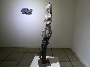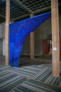 Férielle Doulain-Zouari è un’artista che possiede una grande manualità e gusto per i materiali: intreccia, ritaglia, ricompone oggetti tratti dalla vita di tutti i giorni fondando nuove, inedite narrative con essenzialità e abilità compositiva. Il titolo dell’opera Current water ha un significato ecologico, espresso con tubi di plastica disposti in modo da formare una grande cortina blu.