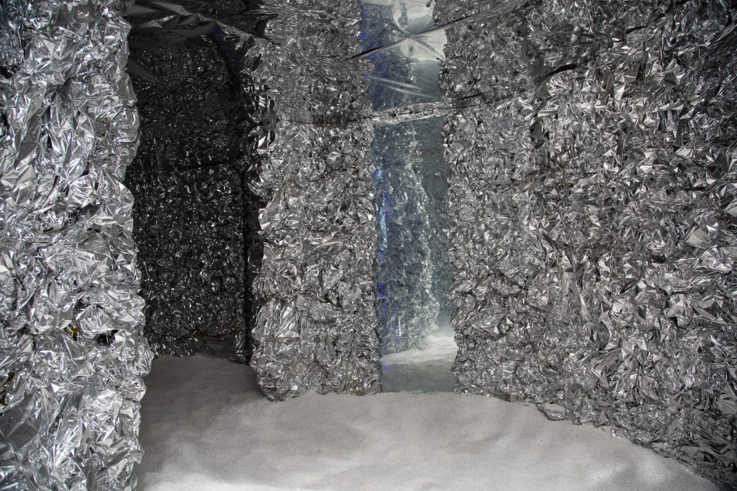 Caroline Gueye è una figura eclettica: figlia d’arte, ha una formazione da astrofisica e ha studiato il cinese e scultura in Cina. I suoi lavori si riferiscono alla scienza, che viene tradotta in arte visiva: contenuti, leggi e regole dell’astrofisica diventano installazioni, sculture e fotografie. Il titolo dell’opera della Biennale Quantum Tunnelling (2021) indaga quanto accade nella scala infinitesimale dei quanti, laddove si confondono lo statuto di corpo e quello di onda dei quanti stessi. L’effetto tunnel è un fenomeno bizzarro che viene espresso attraverso la plastica, la stagnola e gli specchi in un’installazione immersiva di grande effetto per lo spettatore. Le riflessioni di Caroline toccano le realtà degli universi paralleli, i diversi tipi di fisica, i buchi neri e il concetto relativo di tempo.