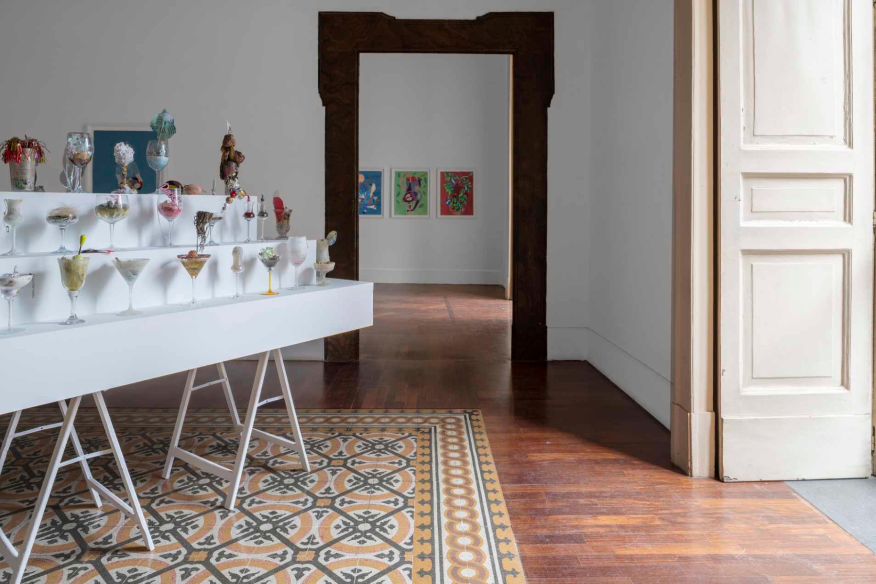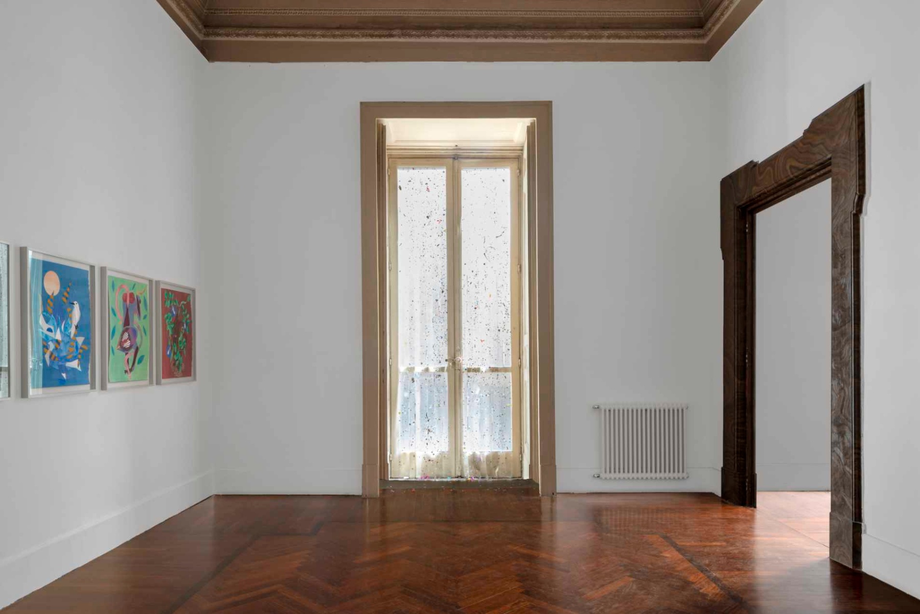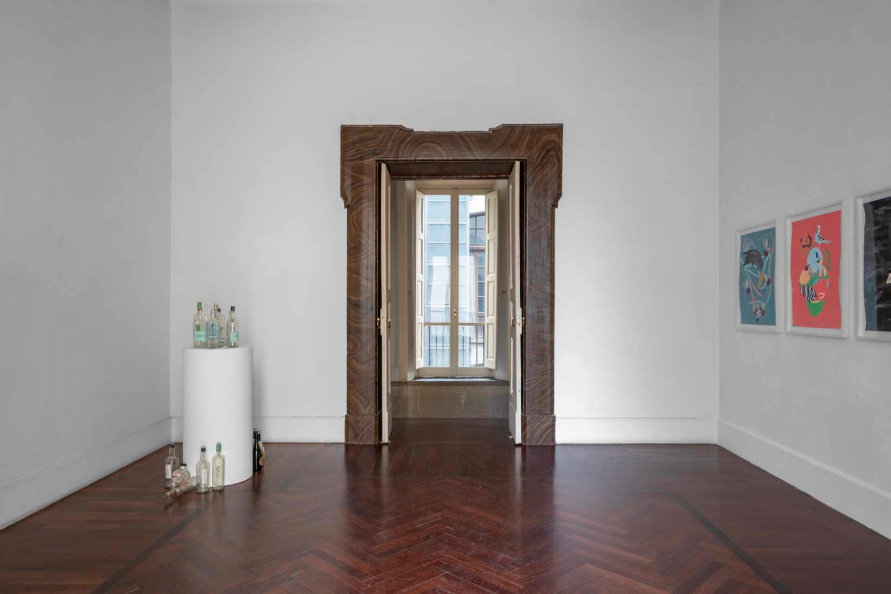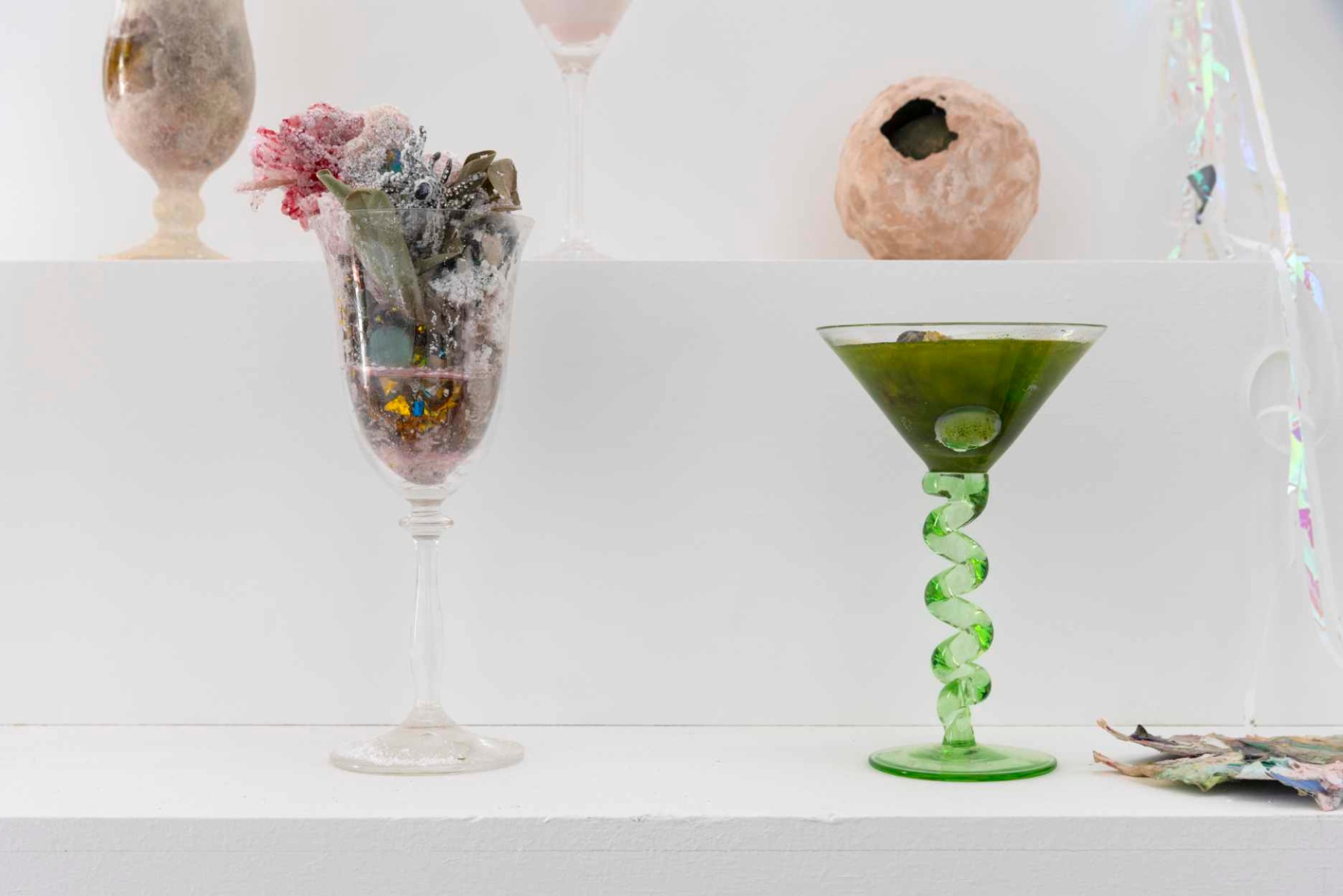 Così, nella fantasia, quella festa si è svolta, e nella galleria sono disseminati i rimasugli dei festeggiamenti: bottiglie vuote, bicchieri da cocktail e da sfrenati brindisi. Ma siccome niente è casuale, sulle bottiglie vuote ci sono delle frasi, che continuano il dialogo tra Damir e Tiziana, che raccontano di delusioni (anche del mondo dell’arte). I bicchieri diventano delle sculture da tenere in mano, nelle quali si stratificano i resti della festa: collane di perle, mozziconi di sigarette, “simboli della sorellanza”. Il tutto “osservato” dagli animali dei Dragforms (dal pappagallino di Abseil Oomph Lips=Psellismophobia; dalla scimmia di Euphoric Baton=Counterphobia; dalla volpe e dalla clitoria di Oho I Probate=Erotophobia; dall’utile sterna bianca di His Boat so Alpha=Talassofobia; dal corvo di Podia Box Ho=Doxophobia; dal barbagianni di A Pair Hope Bio=Apeirophobia) che raccontano del vasto catalogo delle fobie umane, e “protetto” da una “tenda” sulla finestra intessuta dai brandelli strettamente legati alla vita dell’artista, da polvere e glitter, opacità e luccichii, distruzione e speranza, disperazione e gioia. Con la speranza di superare quell’Anablefobia di Heal a Pain Bob, iniziando col godere della vastità del cielo, raccogliendo quei frutti caduti sì dal cielo, ma ora ai nostri piedi.