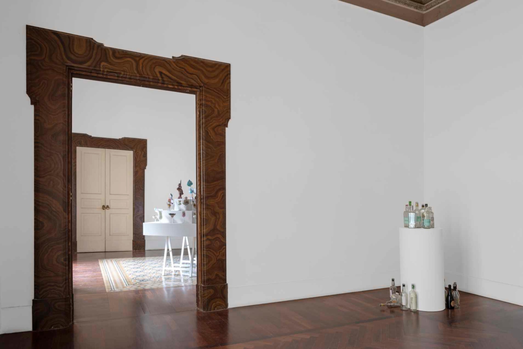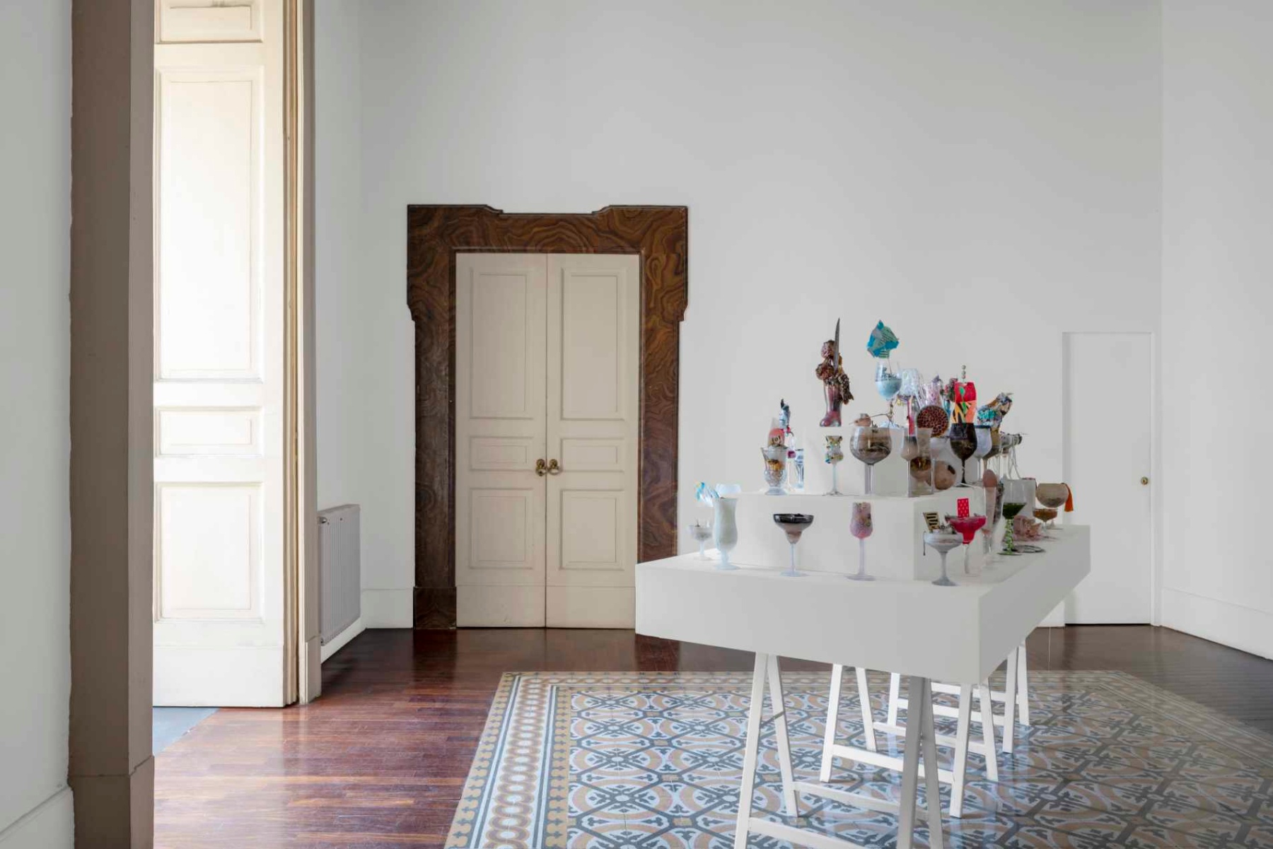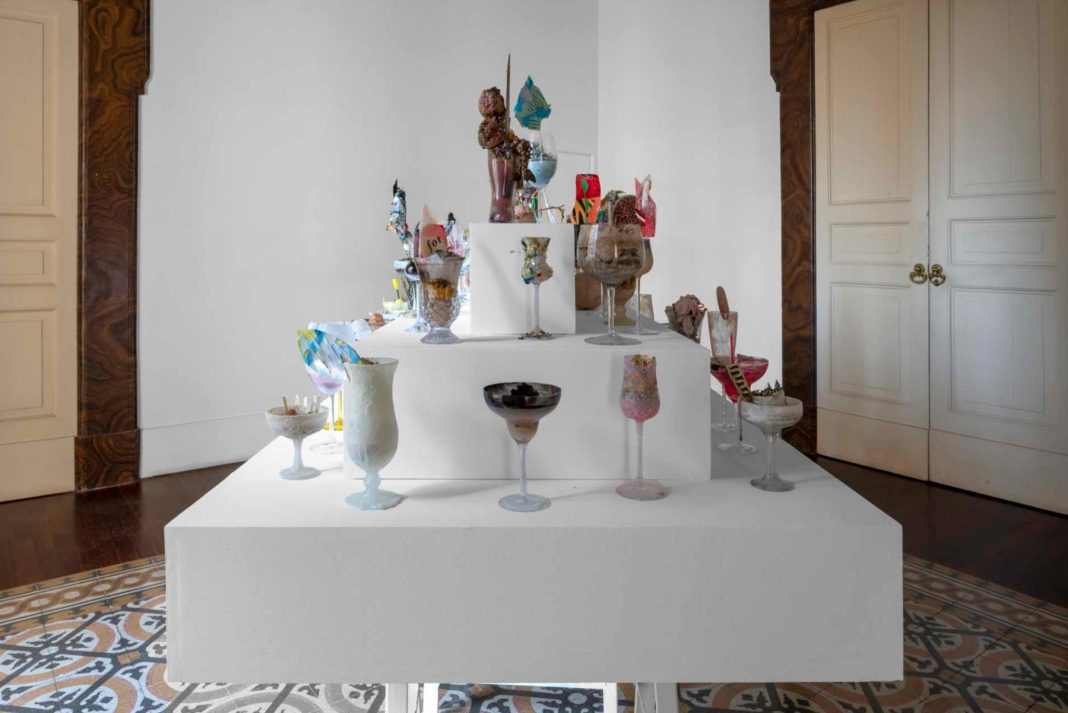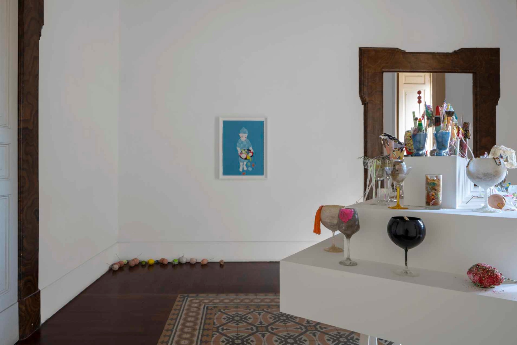 Così, nella fantasia, quella festa si è svolta, e nella galleria sono disseminati i rimasugli dei festeggiamenti: bottiglie vuote, bicchieri da cocktail e da sfrenati brindisi. Ma siccome niente è casuale, sulle bottiglie vuote ci sono delle frasi, che continuano il dialogo tra Damir e Tiziana, che raccontano di delusioni (anche del mondo dell’arte). I bicchieri diventano delle sculture da tenere in mano, nelle quali si stratificano i resti della festa: collane di perle, mozziconi di sigarette, “simboli della sorellanza”. Il tutto “osservato” dagli animali dei Dragforms (dal pappagallino di Abseil Oomph Lips=Psellismophobia; dalla scimmia di Euphoric Baton=Counterphobia; dalla volpe e dalla clitoria di Oho I Probate=Erotophobia; dall’utile sterna bianca di His Boat so Alpha=Talassofobia; dal corvo di Podia Box Ho=Doxophobia; dal barbagianni di A Pair Hope Bio=Apeirophobia) che raccontano del vasto catalogo delle fobie umane, e “protetto” da una “tenda” sulla finestra intessuta dai brandelli strettamente legati alla vita dell’artista, da polvere e glitter, opacità e luccichii, distruzione e speranza, disperazione e gioia. Con la speranza di superare quell’Anablefobia di Heal a Pain Bob, iniziando col godere della vastità del cielo, raccogliendo quei frutti caduti sì dal cielo, ma ora ai nostri piedi.