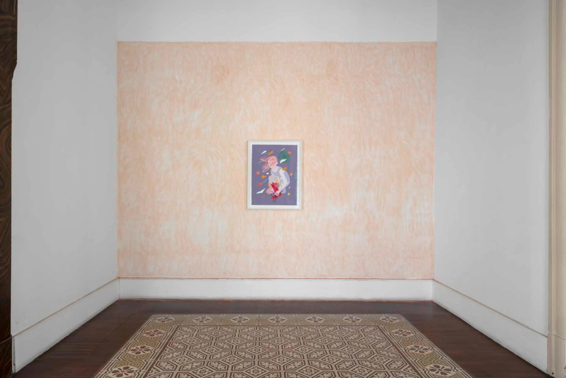 Un ambiente, quello plasmato negli spazi della galleria, intimo, finanche gioioso, che mal cela guizzi di nostalgia. Un’atmosfera avvolgente, profondamente intessuta di fisici frammenti intrecciati a private memorie biografiche. Sin dalla prima opera magnificamente esposta nel primo ambiente della galleria. Come un diamante, un bene prezioso, il primo collage -o, come ribattezzati dall’artista stesso, DragForms-, solitario, al centro della parete di fondo, per l’occasione imbellettata con della “cipria” (si passi la libera similitudine), i cui granelli residui si sono depositati sull’alto battiscopa e sul pavimento. Una bambina (?), dai lunghi capelli attraversati dal vento, china nell’atto di allacciarsi uno scarponcino rosso, lo sguardo verso l’infinito. Su una gouache su carta, Damir Očko ha steso coriandoli, glitter, tessuto, lamine di metallo, foglie di carta e, anziché apporre la sua firma, in una sorta di cartiglio, di umanistica memoria, ha posto il titolo dell’opera su uno dei fluttuanti ritagli: Boot Plash Alibi. Annunciando tutti gli elementi chiave dell’insieme dei lavori esposti. A partire dal titolo.
