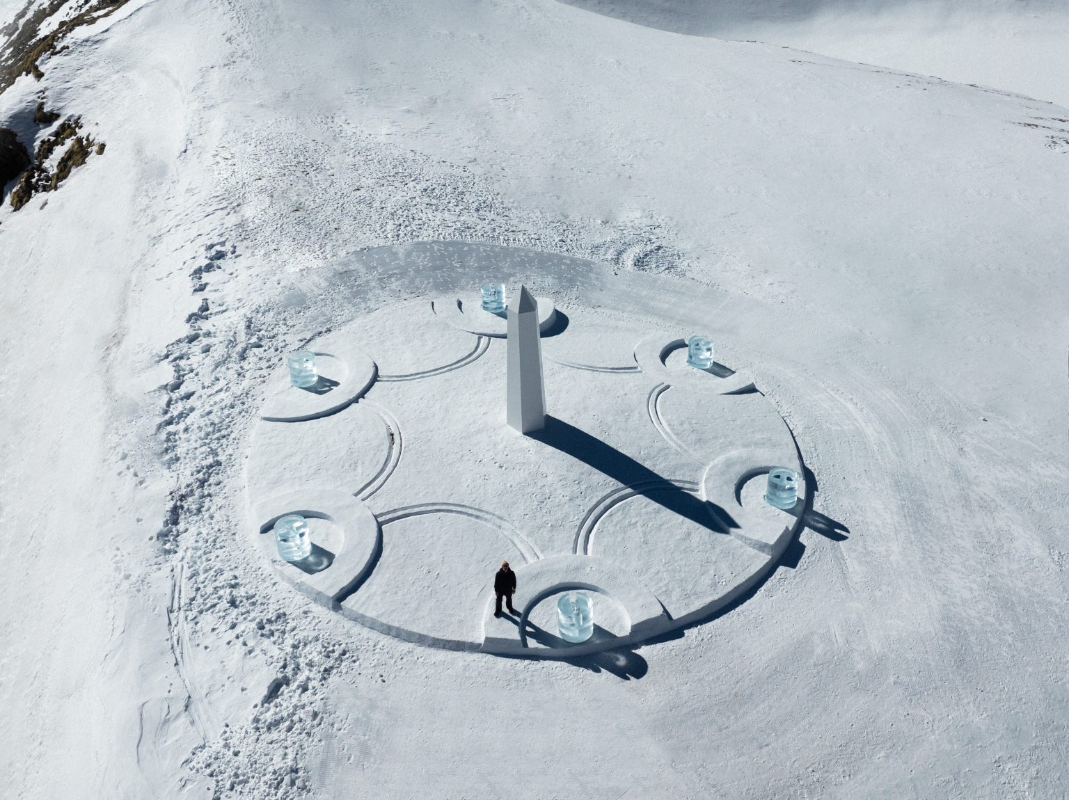 “Light & Time” è il titolo dell’installazione di Daniel Arsham per Hublot, una meridiana composta di ghiaccio e neve, dunque effimera, proprio a sottolineare, in maniera evocativa, l’inafferrabilità del tempo. A meno che non sia racchiuso in un bel quadrante, certo. Sia lo gnomone – questo il nome tecnico della parte dell’orologio solare che proietta la propria ombra – che il disco sono stati realizzati modellando solo ghiaccio e neve posatasi sulle montagne nei dintorni di Zermatt. Per vedere l’opera d’arte, è necessario prendere la seggiovia ad alta velocità Hublot-Express che sale fino a poco meno 3mila metri.