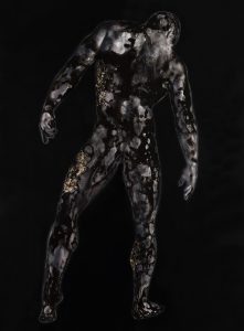 Il corpo, oggi come in passato, è strumento politico, moneta di scambio, oggetto del desiderio, mezzo attraverso cui veicolare il pensiero, i gusti, i consumi. Danilo Ambrosino va oltre i tendini, la carne le ossa e la conclusione estetica che ne deriva, mettendo in luce con foglia oro ciò che rende l’anatomia comune un uomo unico.