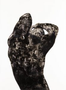 «Eppure devo essere sincero: i miei quadri non sono stati fatti appositamente per questa esposizione – confessa Ambrosino – A novembre 2019 ho partecipato con alcuni di questi dipinti a una collettiva al MAC di Milano, curata da Valerio Dehò. Fu una mostra a tal punto visitata e gradita che mi è venuto in mente di ampliare la serie e di farne una mostra dedicata, da far girare. Poi è successo quel che sappiamo: la pandemia, il lockdown. In quel momento di stasi ho iniziato a lavorare con la curatrice Olga Scotto di Vettimo alle prime fasi di questo progetto. In quel periodo ho anche iniziato a rompere il bicromatismo nero-bianco con la foglia oro». Venature, fessure e contorni ricolmi d’oro delineano la forma umana che domina i ventuno dipinti di grande formato. «Indipendentemente dal risultato estetico, l’oro in questi lavori ha un duplice significato. Da una parte è un rimando alle coperte termiche utilizzate oggi nel primo soccorso dei migranti, che appunto sono dorate. Sono un po’ una medaglia, nel momento in cui la indossano comprendono di avercela fatta, di essere salvi. Dall’altra parte richiama l’antica arte giapponese del Kintsugi, la riparazione delle crepe delle antiche porcellane attraverso saldature colorate con polvere d’oro zecchino. L’oro è l’esaltazione delle ferite, dei segni lasciati dalla vita e quindi un omaggio all’esperienza» conclude l’artista.