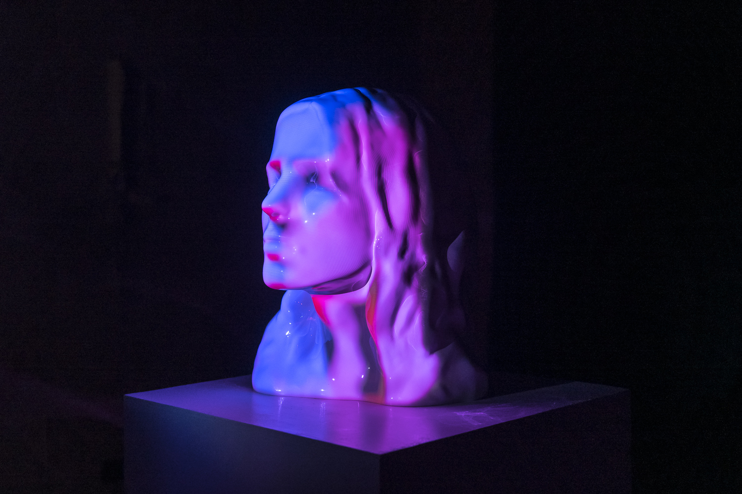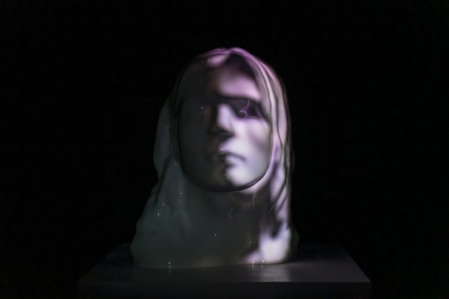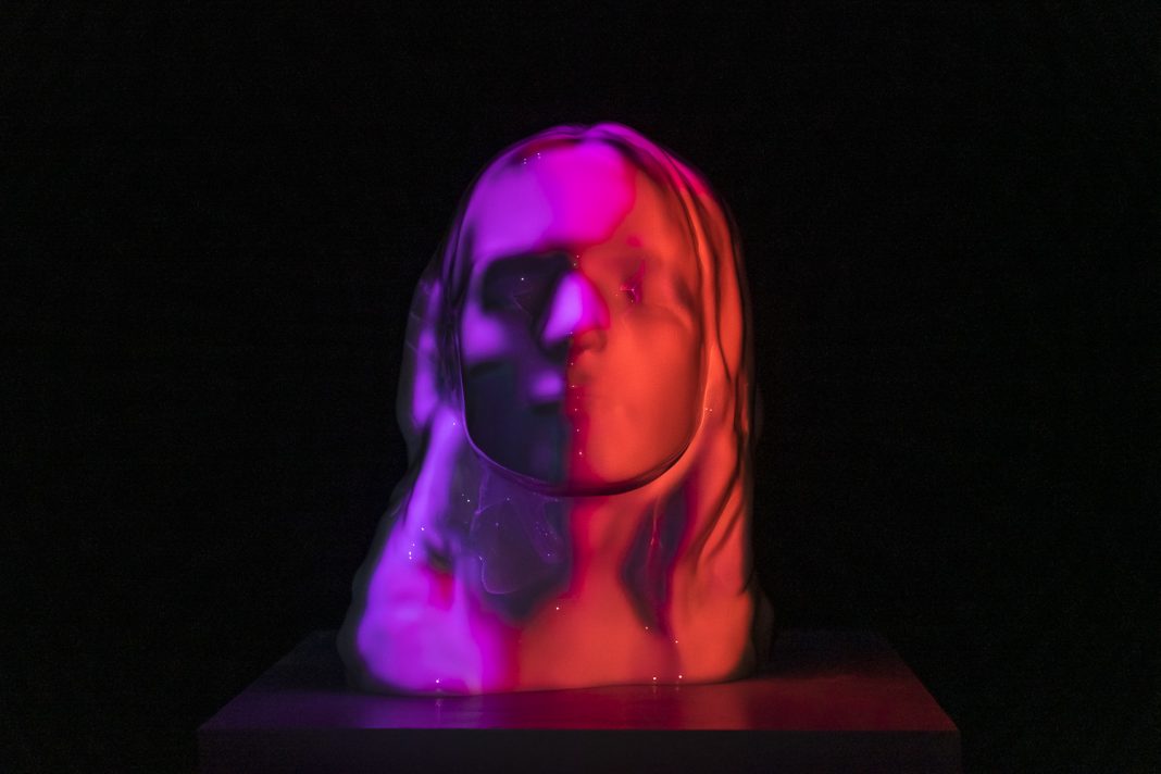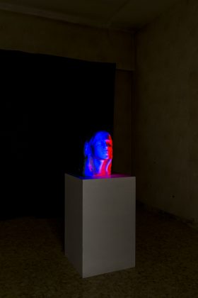 I miss you more when I have happy moments to share (2021) è l’installazione ambientale che Davide Serpetti ha realizzato in collaborazione con Karol Sudolski. Qui, la serialità dell’esercizio pittorico si espande. Immersa nel buio di una stanza, la scultura che riprende il soggetto dei dipinti si illumina con un’animazione di pattern digitali. Sono elaborazioni virtuali tratte dagli stessi dipinti di Serpetti in cui ogni pixel si dispone a fianco all’altro proiettandosi in un flusso lento e colorato. Un’immagine che ricorda il luogo del “sonno paradosso”, ovvero la fase REM in cui sogniamo. Così, prende forma la terza dimensione del sonno. «In questi ritratti chiunque potrebbe identificarsi, perché fanno della sfuggevolezza, della mancata messa a fuoco, della possibilità proteiforme di cambiare, rompendo le regole di un destino già scritto, il loro punto di forza.»