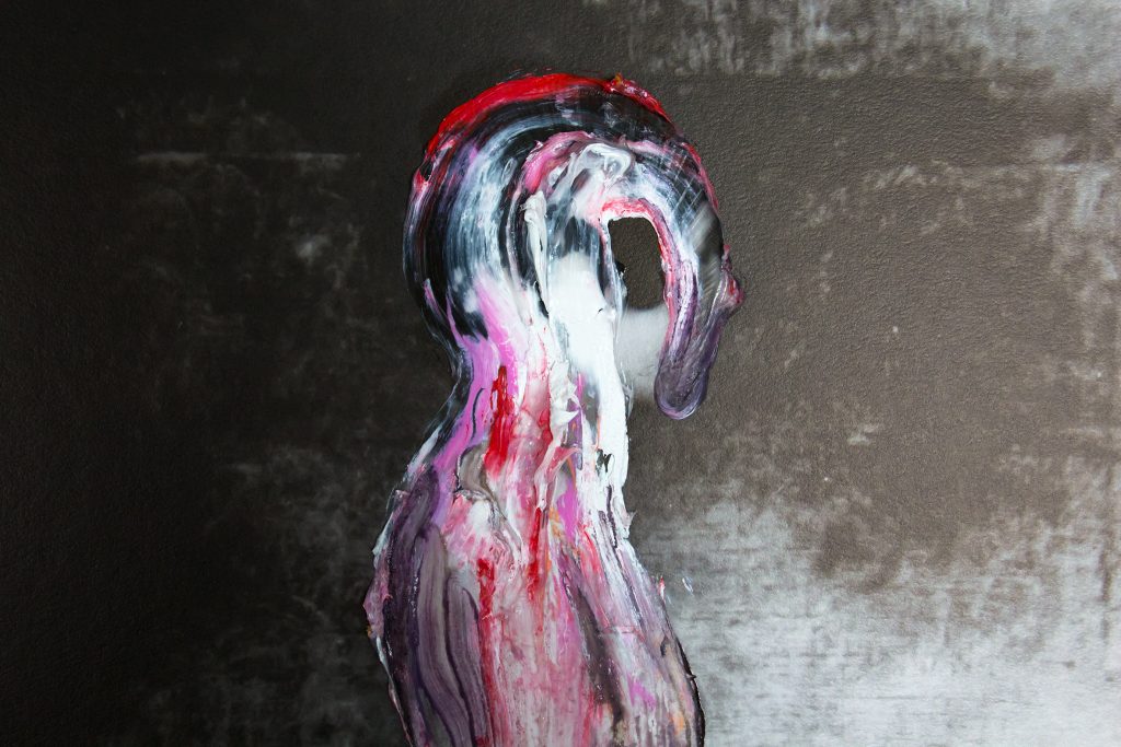 La stampa fotografica di un cervello del 1920, di quando la patologia si ricercava nel difetto fisico (Cervello di pazzo, 2023), comunica con la figurazione della tac di una mente creativa (My brain in lockdown 1, 2020-2021 e Green brain); il video di Pneuma (2020), in prestito dal MAMbo – Museo d’Arte Moderna di Bologna, dove è parte della collezione permanente, è proiettato sopra le sabbie mute di teste di vetro abbandonate (My Head is on fire, 2018); la pittura esce dalle cornici (The language of flowers, 2012; Son of unknown, 2022) e raggiunge la scultura (Even rocks hear, 2023, tra le altre). L’allestimento site specific di Decade è un gioco di rimandi nell’unità di due mondi, dentro e fuori, il visibile e l’invisibile agli occhi, il sé e la norma, l’arte e la scienza che mutuamente si esplorano.