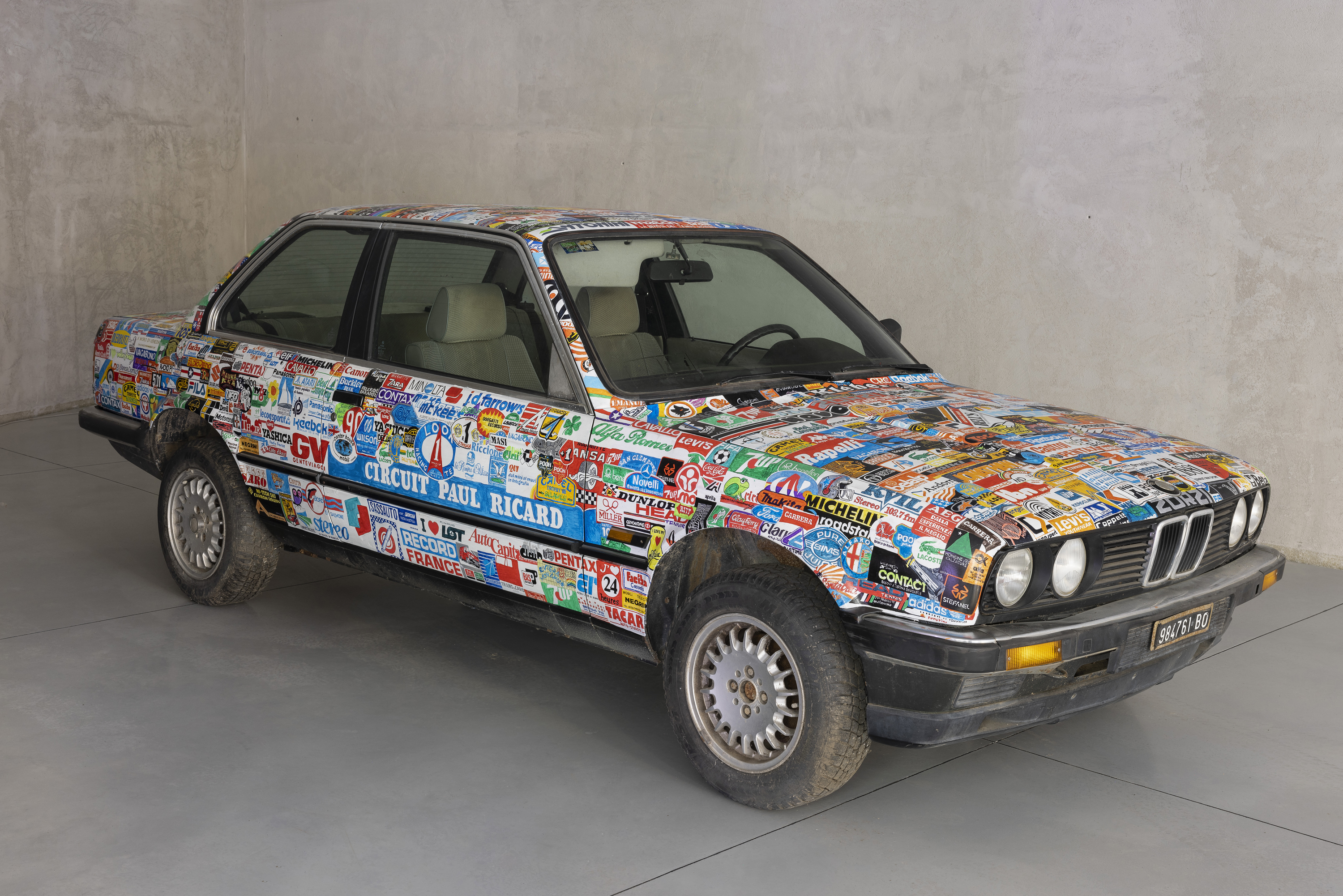 Serravalle, nascosta nella penombra, è infatti una BMW 316 del 1983, interamente dipinta. L’intera carrozzeria è stata ricoperta da centinaia di adesivi originali degli anni ’70, ‘80 e ’90, precedentemente attaccati sopra una pellicola adesiva. Man mano che la “pelle” di adesivi veniva rimossa, l’immagine degli adesivi è stata replicata sulla carrozzeria. La pittura è quindi diventata la falsa copia di quegli stessi iconici adesivi, dipinti in acrilico. Il nostro Paese, mai ritenuto industriale prima dell’avvento della Fiat, ha visto nelle automobili l’inizio di un’epoca e di una nuova storia. Un’Italia dove il mezzo è diventato fine, il trasporto individuale e l’equazione persona+auto= progresso come conditio sine qua non.