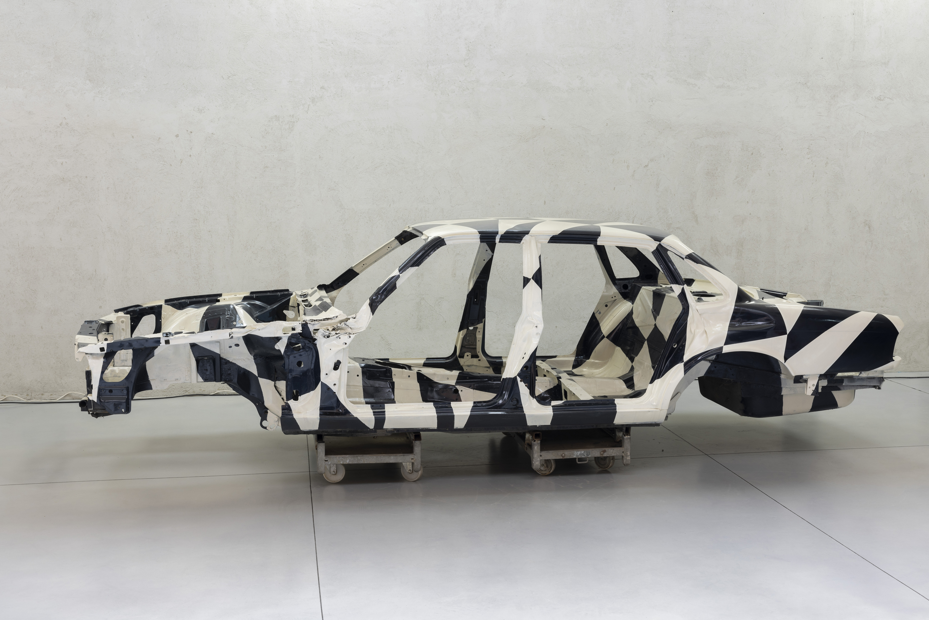 Gran Gala è la scocca dipinta di una Jaguar XJ6 x300 del 1996, appartenuta a una celebre cantante italiana, il cui telaio, nudo e crudo, senza nemmeno un grammo di altri materiali, è dipinto con un motivo razzle-dazzle, in uso nella Prima Guerra Mondiale, rendendo l’auto un residuo glamour che sembra quasi provenire da un altro mondo. Il razzle-dazzle era infatti un sistema di camuffamento caratterizzato da linee intersecanti e figure geometriche, usato per confondere l’osservatore e rendergli arduo percepire la distanza, la velocità e le dimensioni di un oggetto in movimento, come una nave militare.
