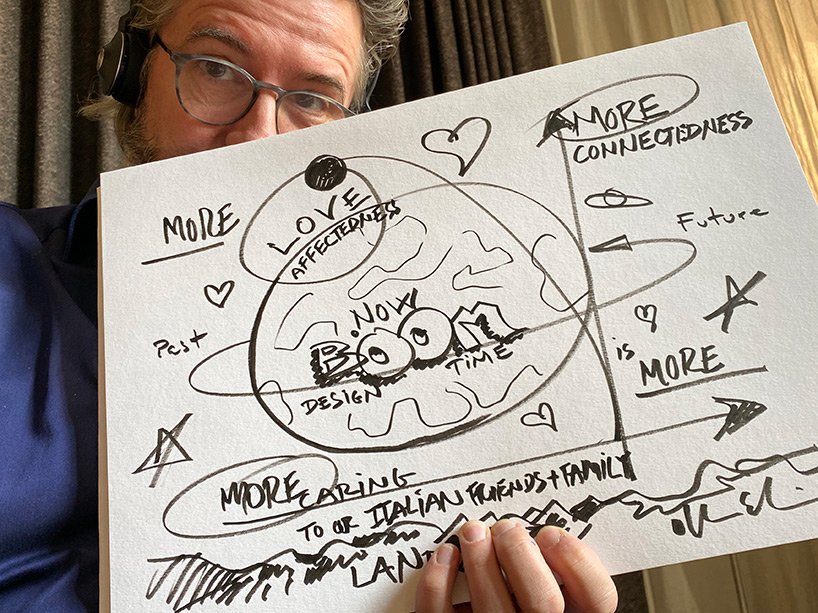 Il disegno che Olafur Eliasson ha realizzato per designboom si compone infatti di una sintetica rappresentazione del mondo, attorniata da stelle e cuori. Questo è attraversato da scritte che incitano i suoi followers e i lettori del magazine a utilizzare il tempo di stallo e isolamento che stiamo vivendo in maniera propositiva. L’opera, un simbolo di sostegno, positività e collaborazione universale, è dedicata al popolo italiano e, in particolare, ai cittadini maggiormente colpiti dalla pandemia. Il messaggio lanciato dall’artista è infatti quello di convertire le nostre energie in forza creativa, amore e cura per il prossimo. Si rinnova quindi il legame sentimentale tra Eliasson e l’Italia, in attesa della tappa a Milano di The collectivity project, installazione partecipativa commissionata dalla Fondazione Nicola Trussardi.