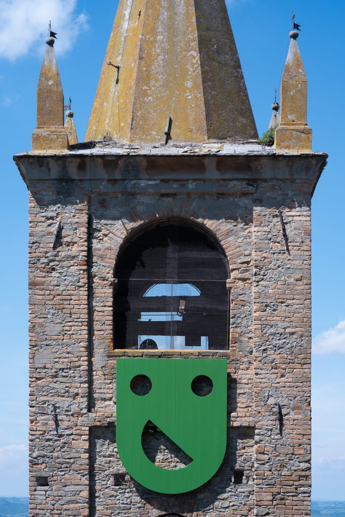 MOODCLOCK è l’orologio a cui mai avresti pensato, ma che un Previdi immerso nelle Langhe ha pensato per te. «Non è nato così» racconta l’artista, partito da un’idea iniziale a base di bandiere (tema a lui caro, Fun with flags vi dirà qualcosa) e pensando a un intervento focalizzato sulla location di Tenuta Cucco. Ma un artista sa che ogni progetto corre per conto suo, così MOODCLOCK alla fine si è espanso fino a toccare un campanile già privo di orologio e campane, conservando intatte due caratteristiche originarie: iconicità pari a quella d’una bandiera e presenza in Tenuta, all’interno di una finestra cieca, elemento architettonico che Previdi definisce «un’anomalia». Un’anomalia che di fatto l’artista, da fine interprete del presente quale è, ha trasformato in un’ulteriore anomalia: un campanile a cinque facce.