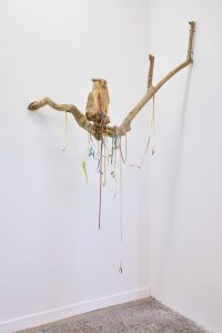 In questo viaggio ci accoglie Beffa Notturna, scultura in legno raffigurante un gufo appollaiato su di un ramo. Il gufo è associato tradizionalmente alla sfortuna. Addobbato con delle stelle filanti (simbolo propiziatorio di festa), acquisisce i tratti di una narrazione straniante e angosciante. L’animale – che guarda fisso la mostra – diviene messaggero per un mondo a venire. Si ispira a presenze infestanti anche l’opera in ceramica La Fontana di Smaragos che invoca uno dei cinque demoni che, nella mitologia greca, affliggevano l’artigiano vasaio.