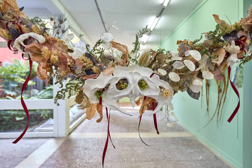 L’importanza di una visione animistica dei lavori discende anche dalla scelta dei materiali. Manipolare una materia o un oggetto manifesta infatti la sua energia potenziale, offre una prospettiva sul mondo e costruisce un “senso della realtà”. Nella ghirlanda di materiali recuperati Giurlanna Berlocco piante vere sembrano finte e piante plastiche appaiono come viventi. La ghirlanda – solitamente addobbata in giorni di festa – si arricchisce di ossa in ceramica che ricordano il rapporto imprescindibile tra vita e morte, carne e spirito.