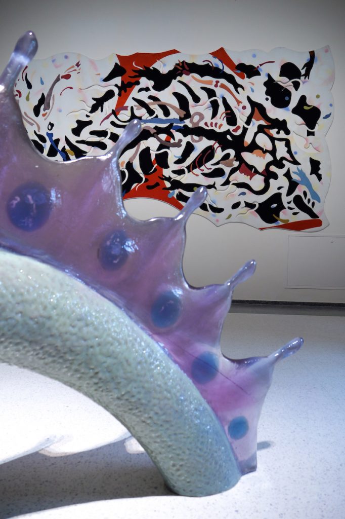 Un’umanità famelica ed ingorda è quella rappresentata dall’estetica afrofuturista di Wangechi Mutu in The End of Eating Everything, 2013 dove la cantante Santingold, trasformata in una sorta di creatura mostruosa, una megastruttura organica, ingoia voracemente uccelli meccanici fino ad esplodere, ritornando in forma ameboide all’interno di un brodo primordiale, preludio dell’inizio di un nuovo ciclo. Una riflessione sul corpo più intima e personale anima la ricerca su l’Homo aquaticus di Agnes Questionmark che si formalizza nell’opera xenomorfa Draco Piscis, 2023 una creatura marina, alter ego dell’artista, dalla forma fluida, impossibile da cogliere nella sua interezza. Una riflessione sulla medicalizzazione del corpo, sul concetto di mostruosità che accompagna il tema della metamorfosi d’identità all’interno di una dimensione transessuale ed interspecie.