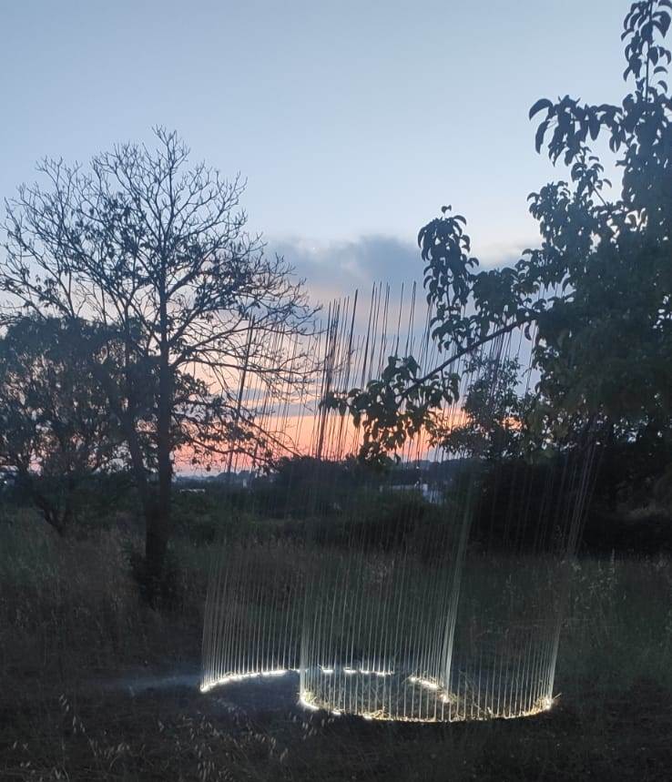 Saltato un giro nello scorso 2020, quest’anno è quello de “le origini” e l’offerta espositiva si è moltiplicata: al percorso di opere consueto, allestito ogni settembre per due giorni sotto i coni all’interno all’abitazione, si sono aggiunte, e in numero considerevole, installazioni site specific ambientate nel terreno. Lungo un camminamento che dall’aia d’ingresso al plesso di trulli, dove si trova un intervento di Massimo Ruiu, porta a un più piccolo altro trullo diroccato, con l’installazione di Ezia Mitolo, si collocano nell’ordine i lavori ambientali di Raffaele Vitto, Pantaleo Musarò, Alessia Lastella, Giovanni Battimiello, i quali propongono altri lavori rappresentativi nelle stanze al chiuso insieme a Sabino De Nichilo, Gianfranco Basso, Damiano Azzizia e Pierluca Cetera.