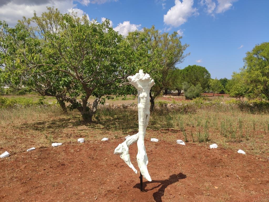 Saltato un giro nello scorso 2020, quest’anno è quello de “le origini” e l’offerta espositiva si è moltiplicata: al percorso di opere consueto, allestito ogni settembre per due giorni sotto i coni all’interno all’abitazione, si sono aggiunte, e in numero considerevole, installazioni site specific ambientate nel terreno. Lungo un camminamento che dall’aia d’ingresso al plesso di trulli, dove si trova un intervento di Massimo Ruiu, porta a un più piccolo altro trullo diroccato, con l’installazione di Ezia Mitolo, si collocano nell’ordine i lavori ambientali di Raffaele Vitto, Pantaleo Musarò, Alessia Lastella, Giovanni Battimiello, i quali propongono altri lavori rappresentativi nelle stanze al chiuso insieme a Sabino De Nichilo, Gianfranco Basso, Damiano Azzizia e Pierluca Cetera.