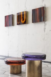 La coppia di artisti e designer, con background diversificati, tra progettazione d’interni e alta moda, attua una sofisticata messa in dialogo di pittura e design.