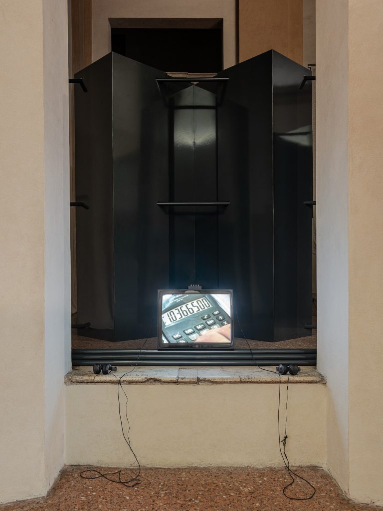 Ad accompagnare la lettura di queste individualità è stato anche l’intervento allestitivo di Fosbury Architecture 一 studio collettivo già protagonista del Padiglione Italia durante la Biennale d’Architettura 2023 一 incaricato per la seconda volta della progettazione dell’exhibition design. Rispettoso del contesto ma incisivo e leggibile, l’approccio adottato da Fosbury Architecture per la Cappella Ducale è consistito nell’adozione di un modulo fisso 一 un pannello metallico nero disposto e combinato in forma di paraventi, fondali e quinte teatrali 一 capace di articolare lo spazio ottagonale in una partitura leggera ma efficace pensata per orientare lo sguardo senza mai bloccarlo e per sostenere le opere senza sovraccaricare il delicato contesto ospitante. Il risultato è un equilibrio delicato nel quale l’architettura dialoga con le opere e ne accoglie la presenza senza rinunciare alla propria forza espressiva. La bellezza austera della cappella non viene oscurata ma ridefinita e temporaneamente abitata da un intervento temporaneo la cui eco, tuttavia, risuona forte in tutto il Palazzo.