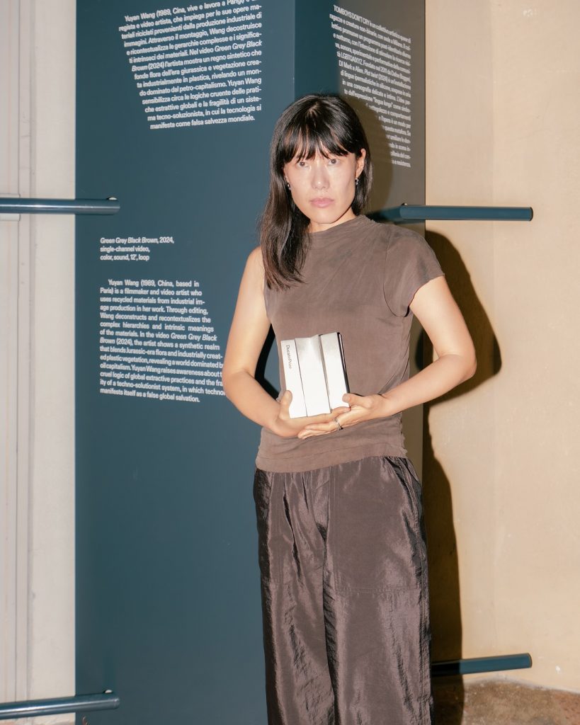Le ricerche degli altri finalisti costruiscono una costellazione di linguaggi che attraversano fotografia, performance, suono e video. Rage (2024) di Yumna Al-Arashi (1988) è un mosaico di immagini e corpi, una narrazione a 800 fotogrammi per secondo che, a partire da suggestioni dantesche e botticelliane, ambisce a decostruire le eredità coloniali e a ridefinire la rappresentazione femminile; George Hraoka Cloke (1992) lavora sulla memoria visiva e uditiva per ricostruire una geografia ideale fondata su temi quali ecologia, inclusione sociale e progettazione urbanistica utopica; la pittura di Besnik Lushtaku (1999) muove a partire dalla memoria come catalizzatore della decontestualizzazione di soggetti eterogenei. Yanqing Pan (2002) documenta l’inesorabile evoluzione della sua città natale con installazioni tattili e stratificate, dove materie organiche interagiscono e si fondono, mentre Ylenia-Gaia Dotti (1999) indaga con la performance il tema del trauma e della violenza di genere. Non mancano interventi scultorei come quelle del collettivo TOMBOYS DON’T CRY, che porta in mostra un lavoro politico sull’identità queer, un’installazione di lingue in silicone sospese in aria che gioca sull’espressione idiomatica e misogina “avere la lingua lunga”, generalmente associata alla sfera femminile. Nel video Diffusion (2024) Cao Shu (1987) affronta poeticamente il tema dell’ibridazione tra realtà e intelligenza artificiale, mentre Andro Eradze (1993), al quale è stato assegnato il Premio Residenza presso Villa FIlanda Antonini a Treviso, evoca una natura fuori controllo, silenziosa e inquietante, al confine tra animale e bestiale. Vincitrice del Premio Residenza presso AMA House (Atene), Pascale Birchler si ritrae in forma di scultura e rappresenta la tensione dell’immobilità, il momento che precede parola e il movimento. Evan Ifekoya (1988) affronta con tagliente umorismo il tema della negoziazione tra l’identità nera e quella individuale. Infine, Ileana Arnaotou e Ismene King (1994, 1993) 一 vincitrici del Premio Residenza che le vedrà ospiti presso la VV Foundation in Lettonia 一 lavorano sulla creazione di un paesaggio a metà tra il naturale e l’antropizzato con una scultura fatta di porzioni di barche e pale eoliche, un relitto capace di evocare scenari distopici e parlare, seppur sottovoce, del dilagante sentimento dell’eco-ansia.