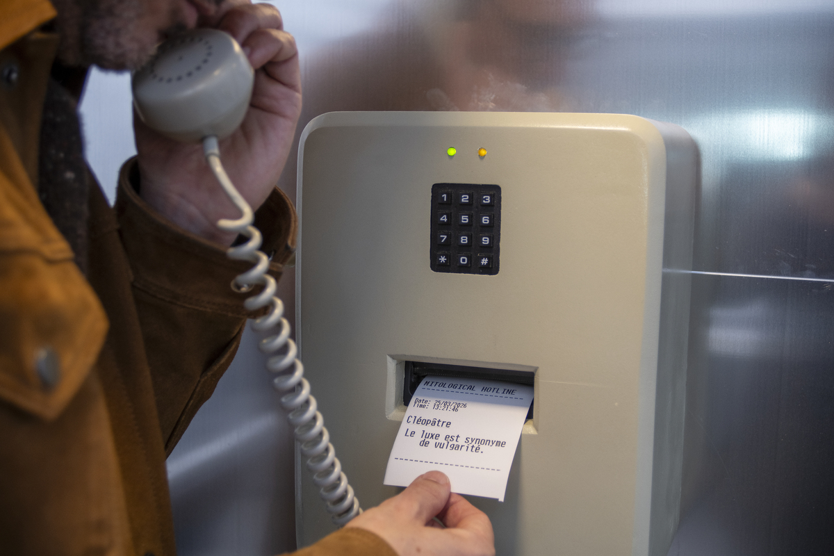 Nella sua essenzialità, il funzionamento è quasi rituale: il visitatore entra nella cabina, solleva il telefono, formula una domanda – qualsiasi domanda: sul lavoro, sull’amore, sul futuro, sul senso della vita – e riceve in risposta un biglietto stampato dalla macchina. Una frase che può essere una profezia, una formula mistica. Ed è interessante come un simbolo che per anni è stato associato alla modernità, che di per sé richiama una delle scoperte che hanno sovvertito la comunicazione, entra in collegamento diretto con i fumi sibillini dell’antica Grecia. Il biglietto che esce dallo slot non prevede nulla e non ti dice cosa fare, ti lascia con qualcosa in mano che solo tu devi interpretare. Esattamente come facevano i greci davanti alla Pizia, tornando a casa con una risposta ambigua e dovendo imparare a conviverci.