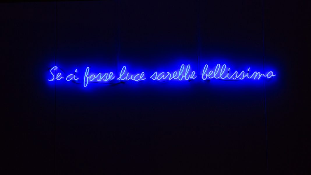 Nell’esposizione forlivese, aleggia una delicata levità che nulla toglie alla pregnanza di significati profondi e richiami alla politica e alla storia espressi con fine eleganza a cominciare dal titolo che è una frase dell’ultima lettera di Aldo Moro nel 1978 alla moglie prima della tragica fine: scritta al neon blu apre idealmente la mostra che poi si chiude con le splendide parole scritte al neon rosso “C’era una voglia di ballare che faceva luce…”, con le quali Francesco Guccini fotografa l’ansia di ripresa dopo il secondo conflitto mondiale.