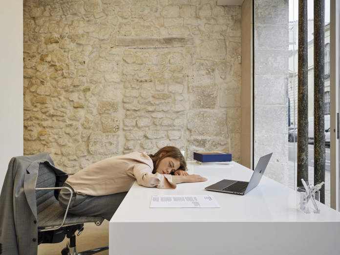 A Parigi, dietro la vetrina su rue de Turenne della sede di Pièce Unique, una sola opera attende lo sguardo dei passanti: una giovane donna seduta alla scrivania bianca di una postazione di lavoro minimalista, la testa reclinata. Il portatile grigio aperto, il catalogo di Fontana chiuso su una piccola pila di altri cataloghi – tra cui uno di Elmgreen & Dragset -, il foglio con il comunicato stampa che descrive se stessa – ciò che la stessa opera avrebbe potuto scrivere di sè. Le scomode scarpe nere con il tacco, il taglio netto del suo abbigliamento, la giacca poggiata sullo schienale della poltrona da ufficio. Tutto sembra studiato per esistere in una sospensione ambigua. Si cercano i suoi occhi, sono chiusi. È viva? Dorme? Si è arresa o si sta proteggendo dal mondo?