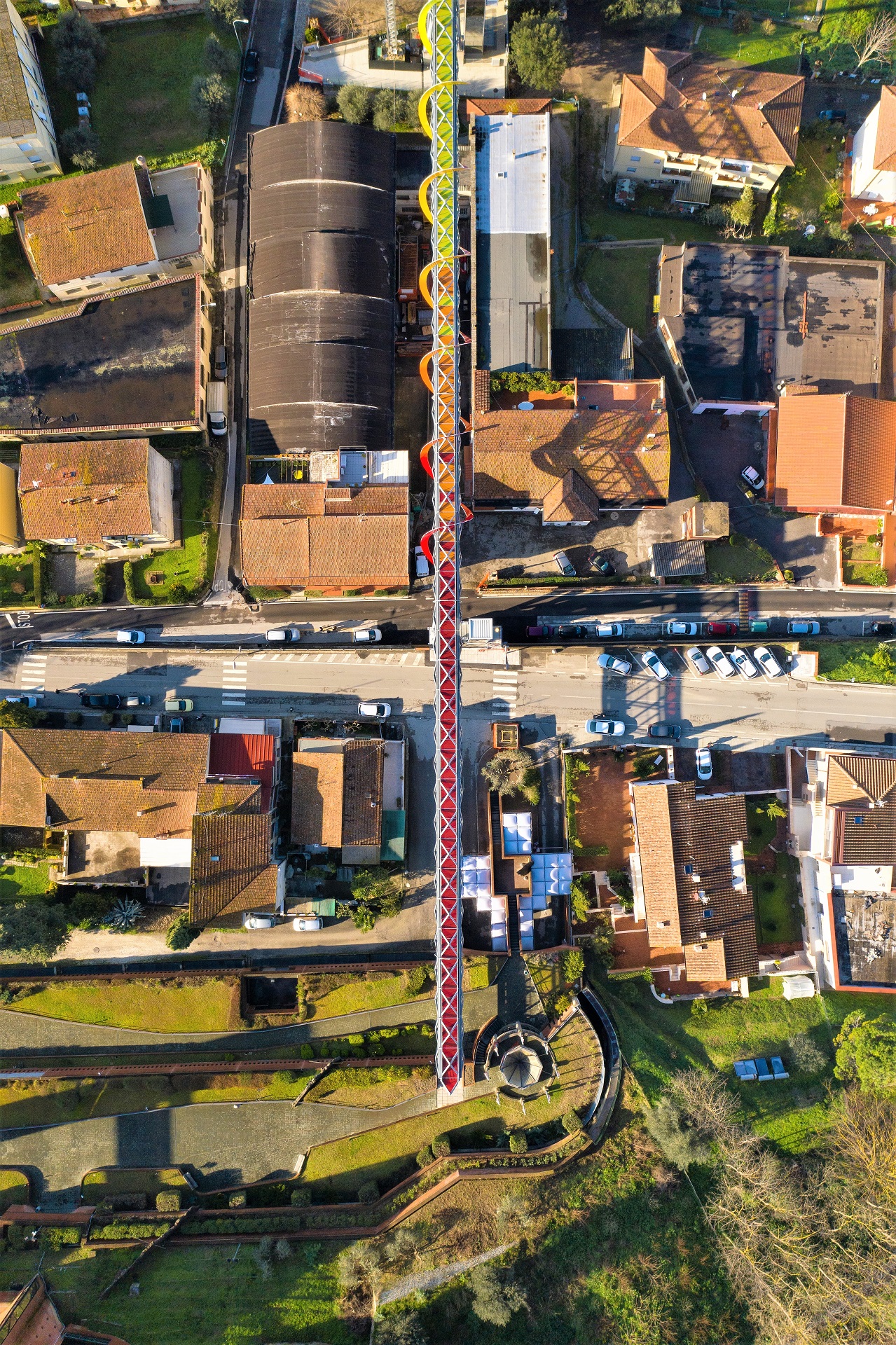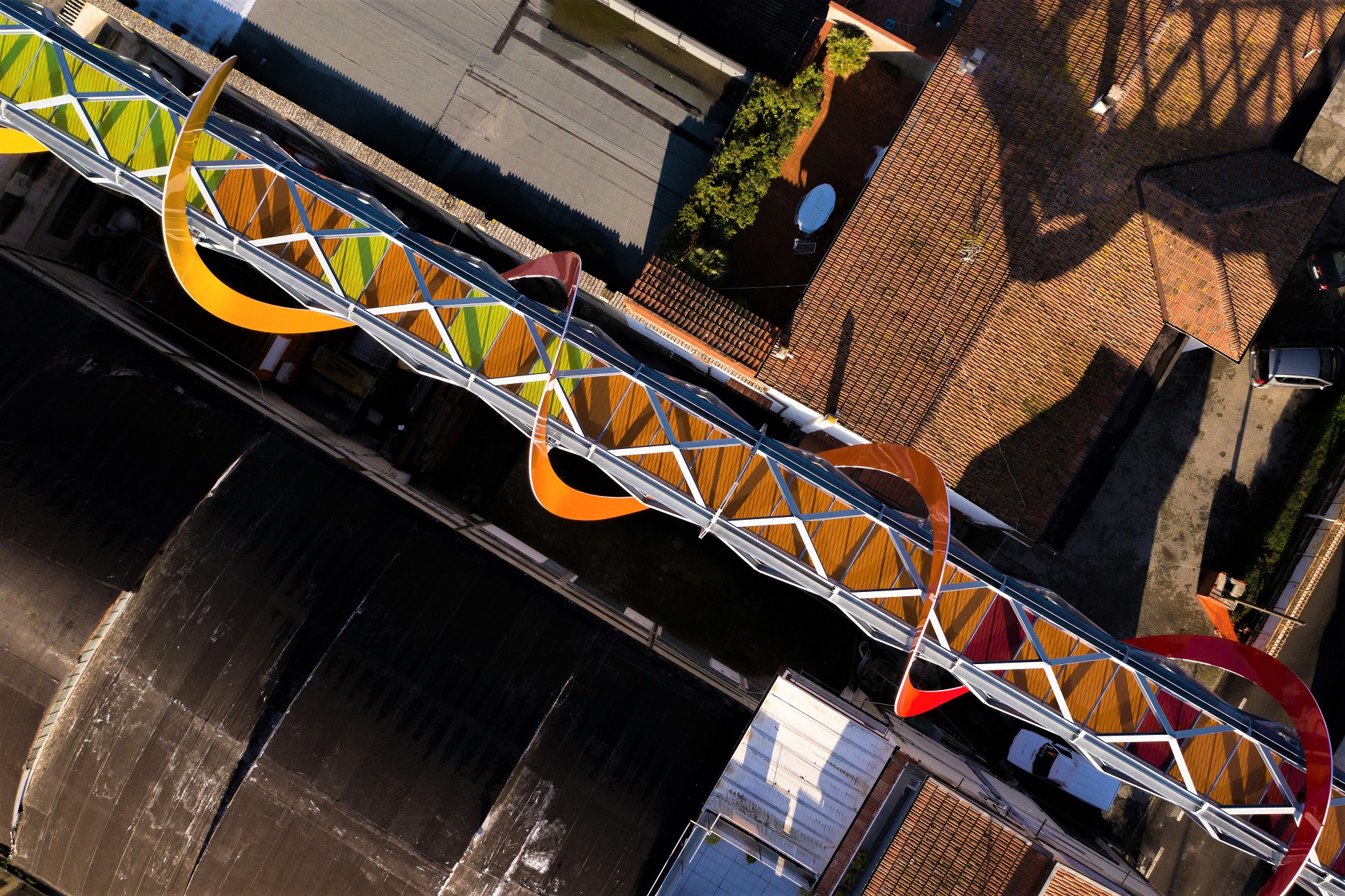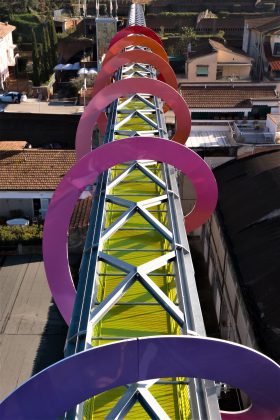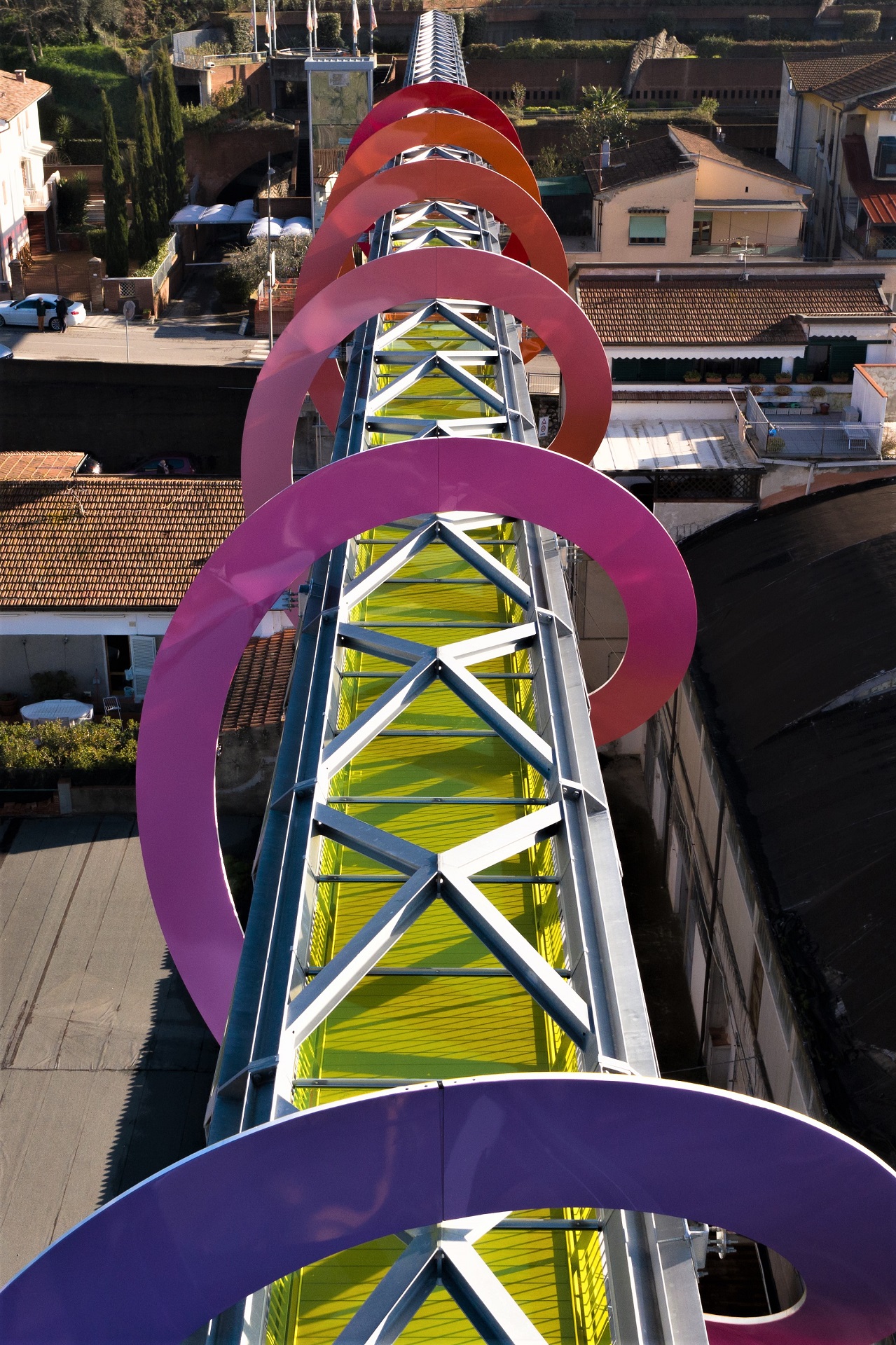 Proprio sul territorio l’artista ha incentrato il suo lavoro, con l’intento di creare qualcosa che ne parlasse e che, allo stesso tempo, fosse accessibile a un gran numero di persone. Con la nuova installazione Endless sunset a Peccioli, Patrick Tuttofuoco ha dato forma al suo più grande intervento scultoreo. Un’opera aperta alla lettura non solo del pubblico avvezzo ai linguaggi dell’arte contemporanea. Tuttofuoco ha operato su una preesistente passerella pedonale, della lunghezza di 72m e posta a un’altezza di 30m. Un lavoro che ha coinvolto progettisti, strutturisti e architetti, figure imprescindibili per un’operazione di tale portata.