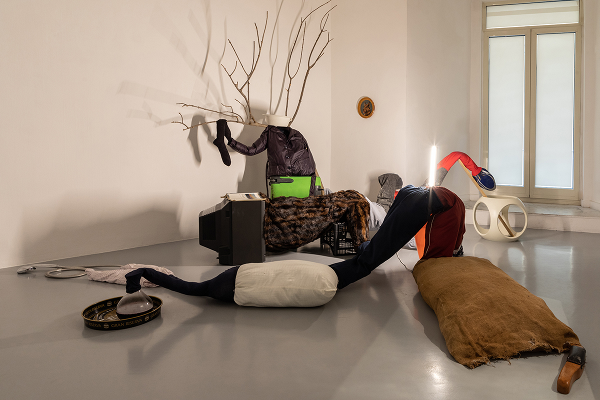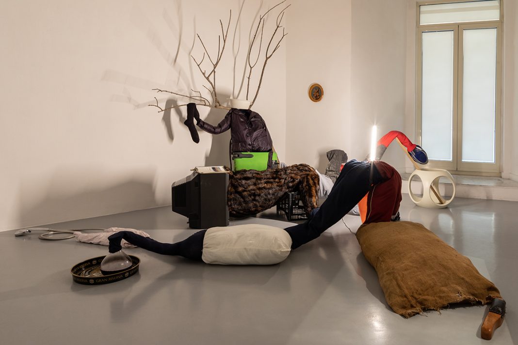 In questa occasione viene presentata parte del progetto Più là che Abruzzi, realizzato sempre nel 2019 e con la cura di Simone Ciglia. La linfa feconda delle periferie, che Tibaldi instancabilmente ricerca e stilla errando in lungo e in largo ai margini delle città, proviene stavolta dalla provincia abruzzese, “al di là” degli Appennini. Ma di Francavilla al Mare, tradizionale meta estiva sul litorale adriatico, l’artista scandaglia ora le insidie di una marginalità che è anzitutto percepita, oltre che indotta da fattori storici ed economici. L’indagine sul territorio in cui si innesta di volta in volta la propria pratica artistica, suo costante modus operandi, è partita da un questionario sottoposto agli abitanti di Francavilla, per approdare a una serie di strutture ibride, in cui l’elemento naturale e quello domestico, il relitto tecnologico e il reperto preindustriale danno forma a composizioni in bilico tra l’organico e l’inorganico, il vitale e l’inerte.