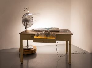 Montaggi di objets trouvées nel peregrinare dell’artista, testimonianze di racconti, di vite, di desideri che prendono corpo negli assemblaggi progettuali – anch’essi in mostra – prima ancora che nelle installazioni. Misurando di quella comunità aspettative e disagi che vengono fuori dai questionari raccolti, da cui l’artista ancora una volta seleziona ed estrae visioni e suggestioni, Tibaldi mette sapientemente insieme paesaggi reali e paesaggi dell’immaginario, aspirazioni e timori che prendono corpo in lavori ibridi, talvolta instabili, talaltra ironici. Se in ogni episodio si possono scorgere i caratteri di bizzarri diorami di cui non è dato sciogliere del tutto l’enigma, è nel dialogo tra opera e progetto, accostati eppure autonomi l’uno dall’altra, che notiamo assonanze probabilmente e parzialmente rivelatrici del processo ideativo.