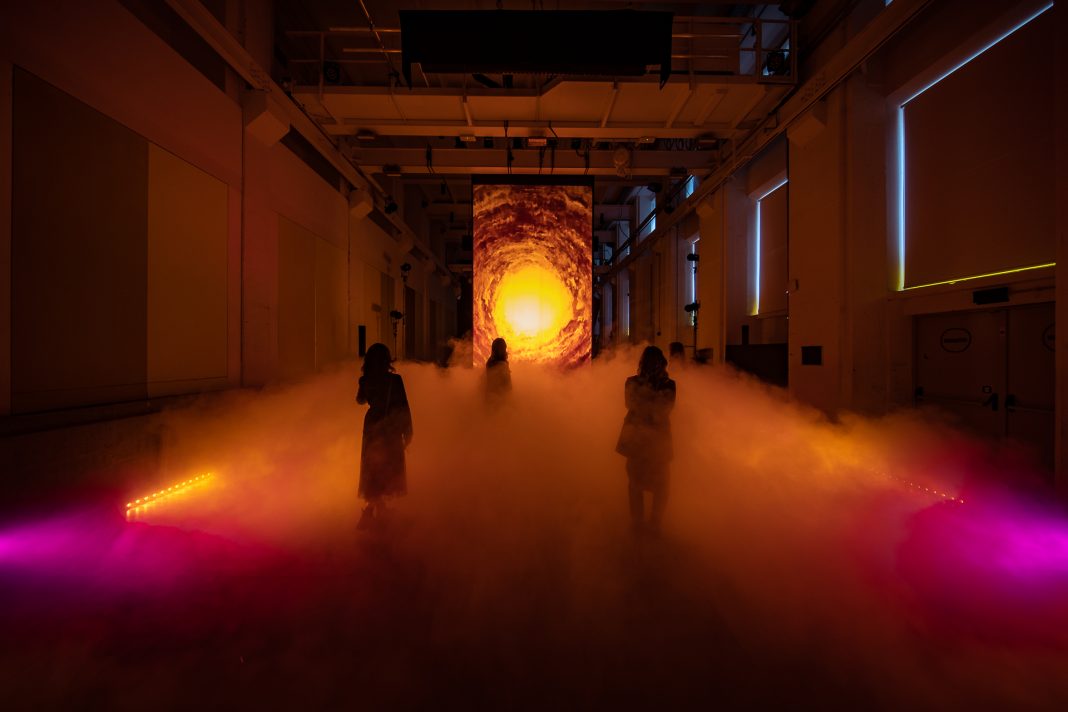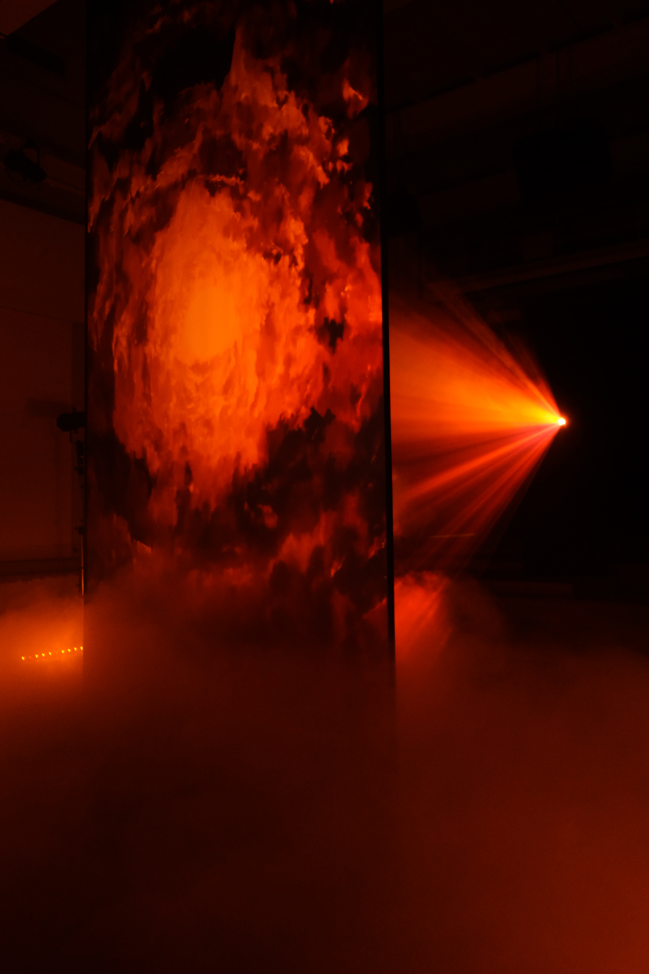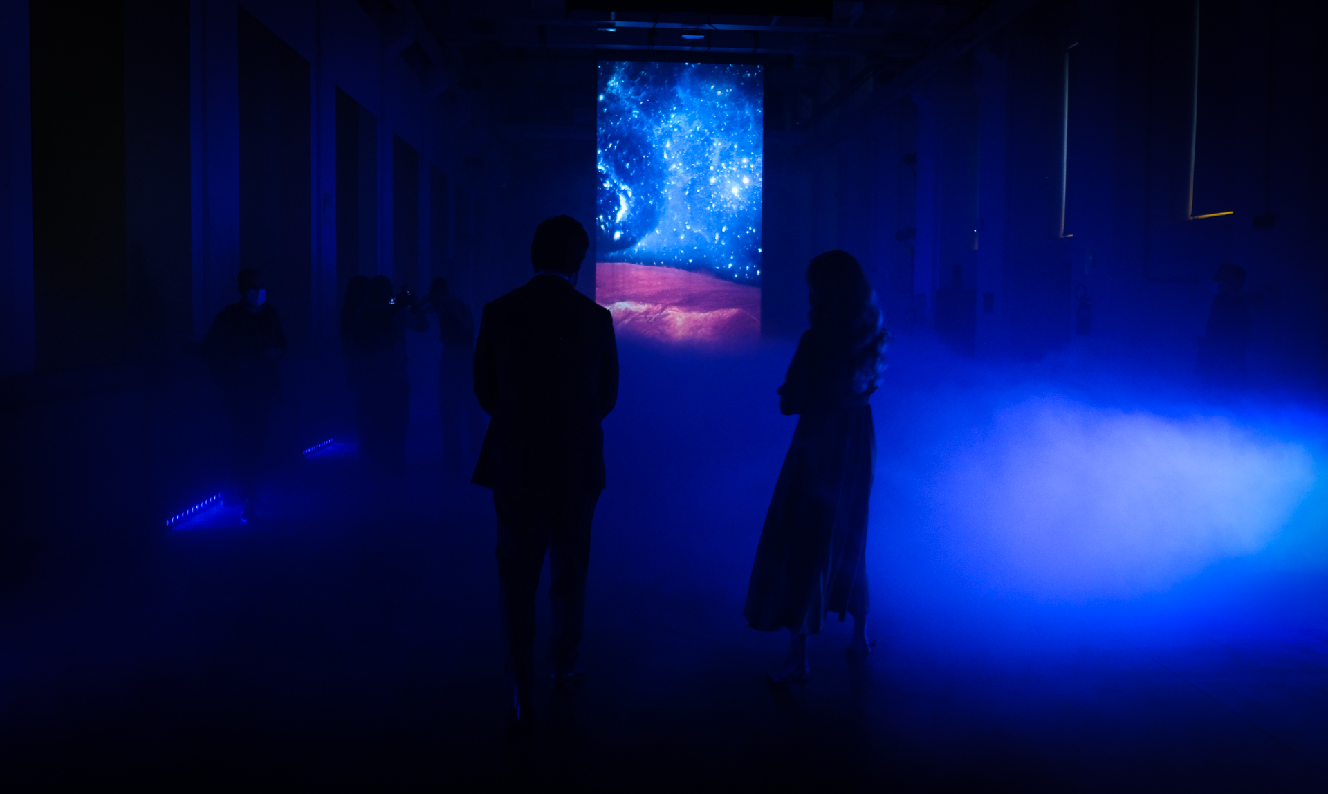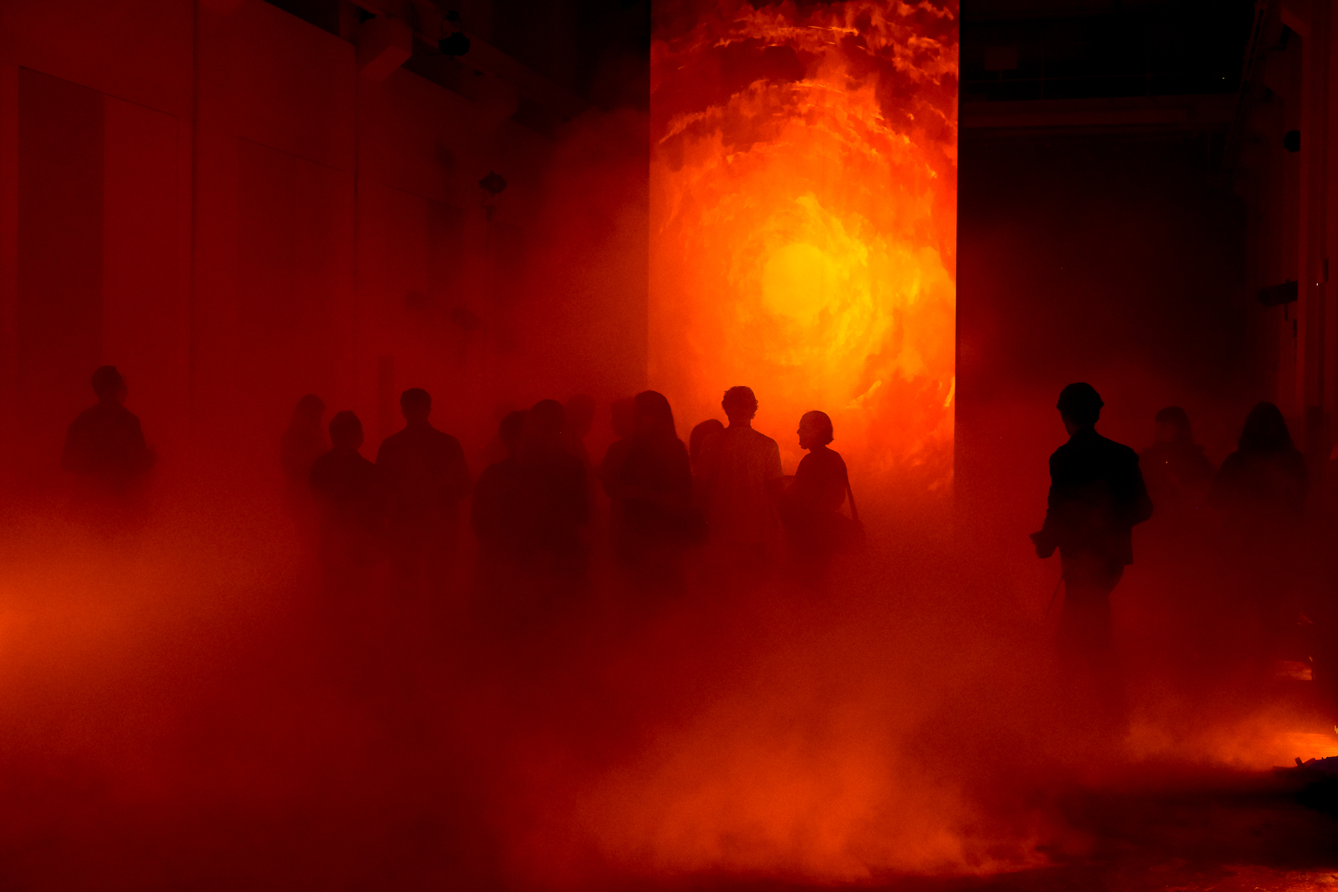 Con questa nuova opera, NONE Collective trasporta il pubblico in un’altra dimensione. Falling dreams è un’installazione immersiva fatta di un’architettura eterea, dove luce e acqua si fondono. Così, una cascata di nuvole alta sei metri invade lo spazio della sala principale di BASE, circondando lo spettatore che si ritrova dentro un paesaggio sospeso, letteralmente tra le nuvole. Con un gioco di colore e di suono, l’atmosfera si fa rarefatta e chi entra in “Falling dreams” si ritrova in un luogo in cui può guardare al di là del cielo. Uno spazio prima straniante, poi familiare. Naturalmente, la tecnologia si fa facilitatrice di onirismo e umanità. «Sospendere il proprio pensiero, lasciarlo disponibile, vuoto e permeabile, distaccarsi da sé e rientrare in sé stessi, così come si inspira e si espira», queste le parole di Simone Weil, tra le ispirazioni di NONE Collective.