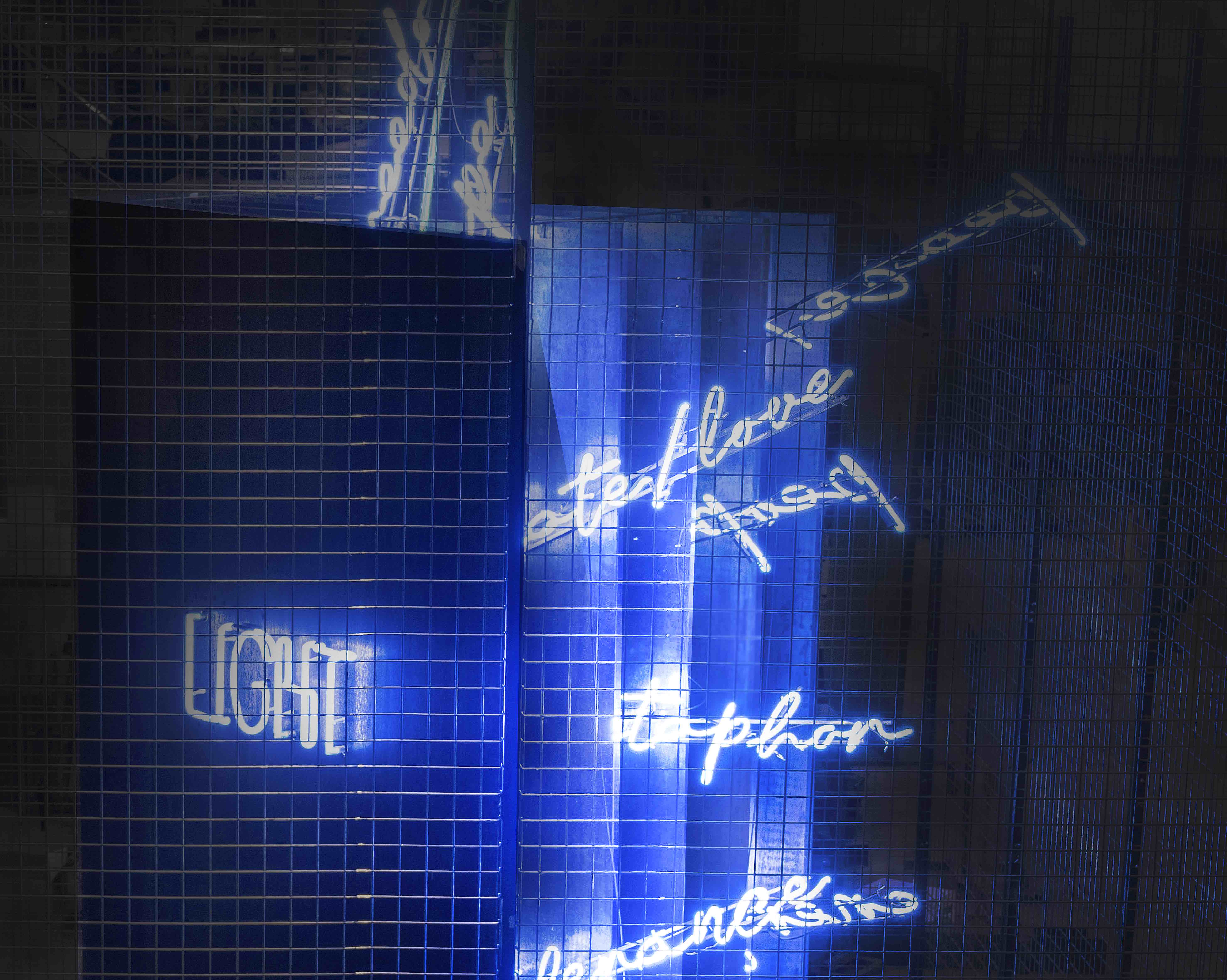 Realizzata in ferro corten, cracked neon blu sempre in movimento e rottami blu di vetro di Murano, l’installazione di luce pensata per Palazzo Reale è l’evoluzione in larga scala del ciclo di lavori di Federica Marangoni sul tema del libro, del linguaggio e della memoria. Fulcro dell’installazione è il libro scultura Light, che si presenta semiaperto e inserito in una gabbia da cui escono parole in neon, segni di una nuova energia vitale che si libera verso l’alto. Il grande volume emerge da un cumolo luminoso di rottami di vetro blu, che sembra dar vita alla luce delle parole.