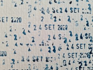 16 SETT 2020 – 01 OTT 2020. Due date. Di inizio e fine. Nel mezzo, migliaia di altre date che si confondono, si sovrappongono, segnano il tempo. Il suo trascorrere. In questo loro rincorrersi, susseguirsi, accavallarsi, creano un’immagine, danno forma a un pensiero, a un’idea, a una visione. Plasmano le riflessioni di Federico Pietrella (classe 1973, romano di nascita, berlinese di adozione) che, proprio a partire dal 16 settembre 2020, ha iniziato a dar corpo ai propri quadri, ai suoi paesaggi e panorami e ritratti, con i suoi ben noti timbri. Ma non tra le pareti del suo studio. Bensì trasformando la galleria Ex-Elettrofonica nel proprio laboratorio. E nell’arco di tempo compreso tra il 16 settembre e il 1° ottobre 2020, Federico Pietrella inizia e conclude il suo primo lavoro per la personale che, per le vicissitudini legate alle norme covid, e conseguenti slittamenti, ha inaugurato il 19 dicembre. Così, con la porta aperta e la grande vetrata che consente di vedere all’interno, chiunque, volendo, poteva osservare il procedere del lavoro di Federico Pietrella, chiedere, chiacchierare con lui, al fine di allacciare, così, una relazione, ancor più agognata in questo periodo di privazione forzata. Una mostra, dunque, che, oltre ad essere stata realizzata site specific, per e nella galleria, nel suo costruirsi, nel suo working in progress, ha mostrato anche l’atto performativo che sottostà ad ogni lavoro, ad ogni creazione artistica, quel tu per tu con la tela, affrontato con una indiscussa e mai abbandonata manualità.
