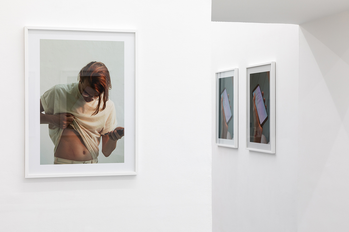 «È ovviamente intuitivo. In fin dei conti, uno smartphone non è uno dei nostri oggetti più intimi? Come tutti gli altri, ci faccio un sacco di cose, anche scriverci poesie. Quindi c’è quel rapporto diretto: il mio smartphone in mano e poi i miei scritti. Questo pezzo è piuttosto intimo, anche il suo titolo, Autofiction, lo dice, mi piace questa sensazione che il visitatore stia sbirciando da sopra la mia spalla la mia privacy (sto parlando del punto di vista nelle fotografie). C’è un photopoem nella mostra che parla di questo desiderio di impiantare lo smartphone direttamente nella mia pancia, come nel mio ritratto, dove vedi un taglio chirurgico sulla mia pancia. Una relazione cyborg, per quanto è intima e incarnata».