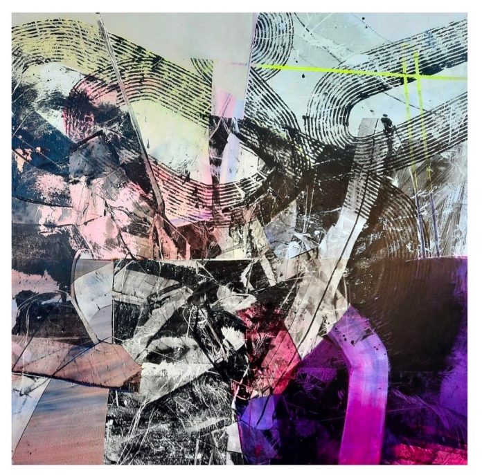 Il titolo della mostra di Masegosa si ispira alla canzone Mind Games, dell’omonimo album di Lennon uscito nel ’73. È diventata una sorta di pretesto per stabilire un gioco di parole. Tutte le opere esposte stabiliscono una dinamica fra di loro nell’intrecciare formati, supporti e materialità, e nel porgere una trappola per gli occhi, stimolando nello spettatore un dibattito tra il razionale e l’emotivo. Insisto sul concetto di “trappola per gli occhi” perché in questi lavori, a differenza della sua produzione precedente, si può intravedere una volontà iniziale di stabilire ordine nel caos. Linee guida, parametri che lui stesso ha segnato usando del nastro adesivo e attaccandolo al telaio, per poi levarlo e travolgere quelle tracce oltrepassando i limiti, o questa sorta d’ordine iniziale che ha utilizzato come punto di partenza. Guida, con la sua pittura, questo “trucco”, dove sembra avere un ordine che viene travolto nel processo creativo.