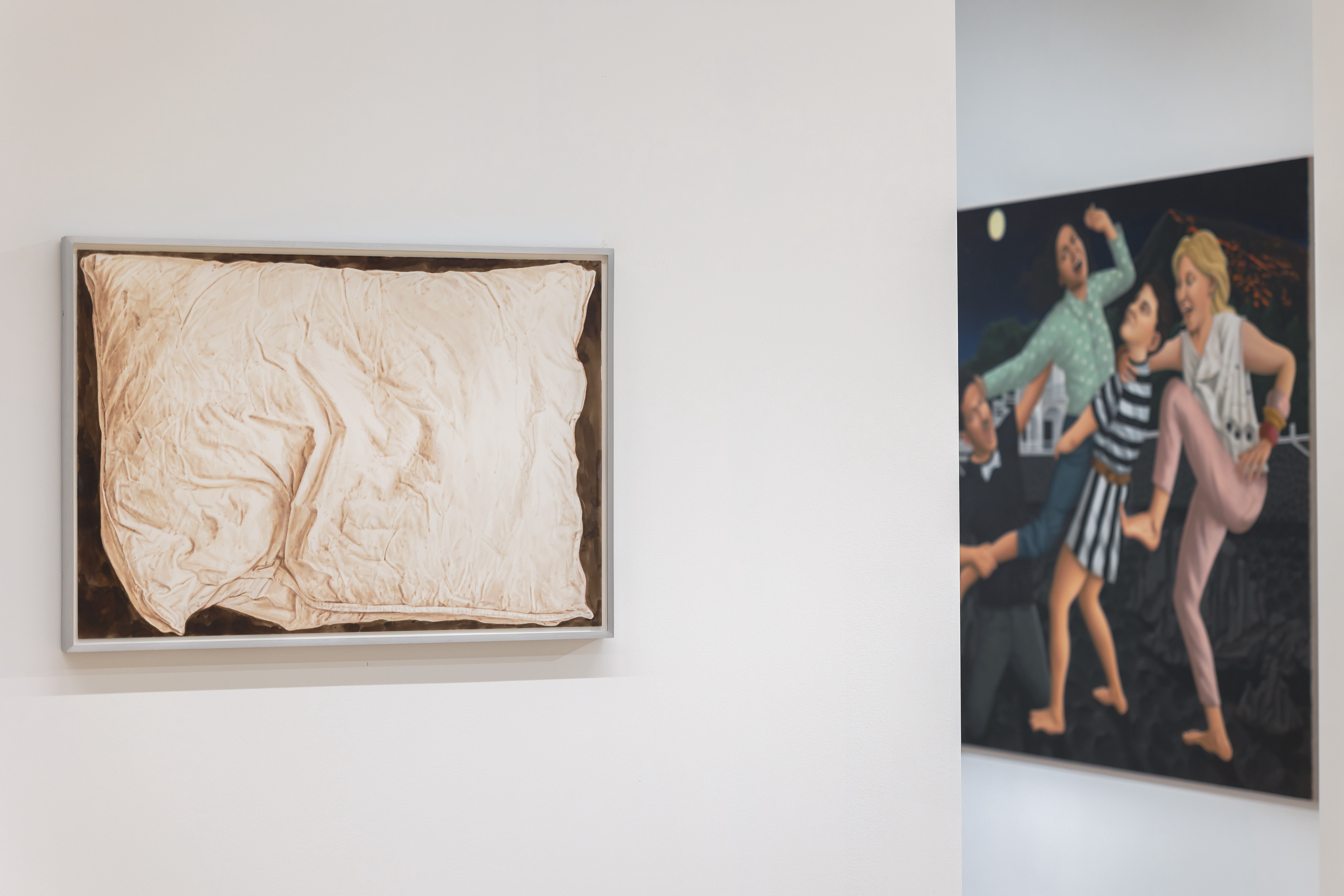 L’opera How many times I have to tell you this ah???, 2018 di Patrizio Di Massimo, è infatti risultato di una traduzione su carta di una foto modificata al computer. Anche Cause and Effect, 2016, di Luisa Gagliardi è frutto di una rielaborazione che, a partire da uno schizzo manuale, attraversa le fasi di scansione, modifica tramite PC, stampa su PVC e rifinitura attraverso smalti. Gli stessi colori verde-viola, che richiamano i riflessi dello schermo dell’iPad e del computer, vogliono riflettere attorno a questa interazione tra corpo reale e virtuale.