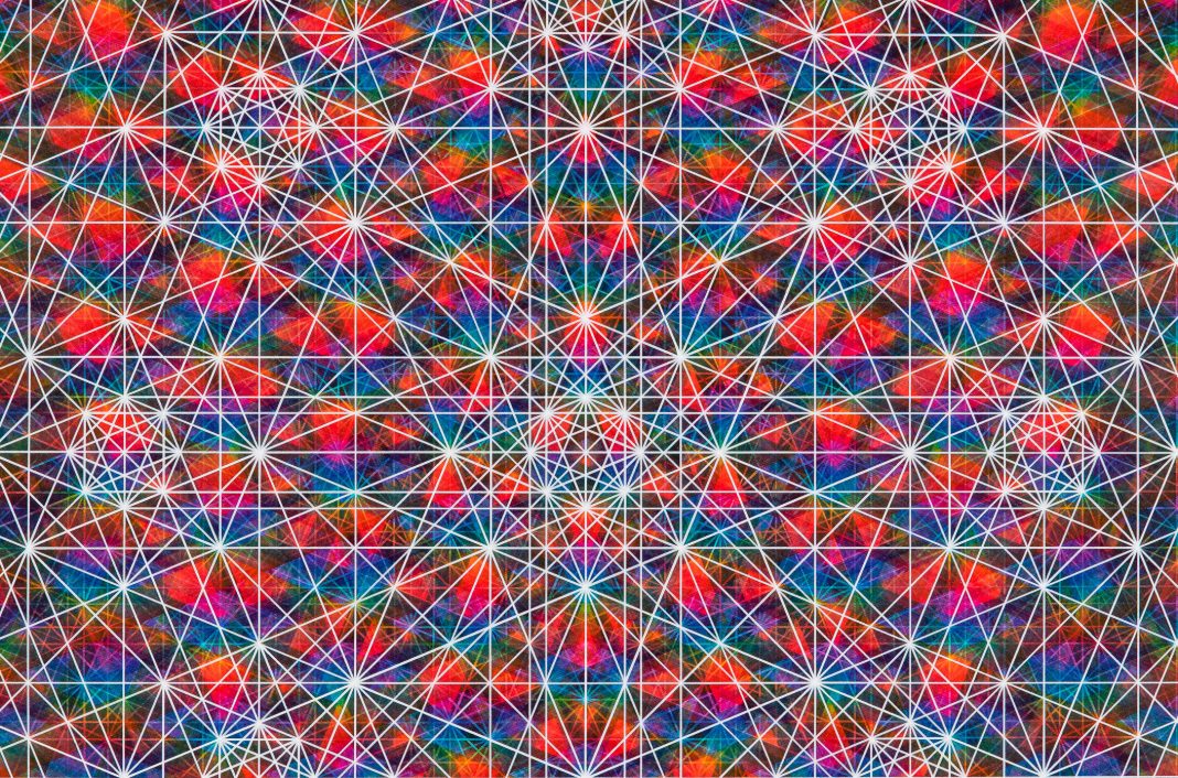 Il mio lavoro è incentrato sull’astrazione geometrica e la sua connessione al mondo naturale, sui processi quantistici e sui fenomeni psichedelici. I miei disegni e dipinti sono manifestazioni fortemente stratificate e guidate da una griglia di strutture immaginate e ordinate. Usando principalmente penne, pittura e righelli, applico simbolismi numerici ripetitivi e migliaia di linee e pixel disegnati a mano per creare la complessità dalle forme semplici. Questo approccio matematico si basa su una pianificazione avanzata, calcoli precisi e diverse metodologie sviluppate autonomamente per garantire un’accuratezza dimensionale vitale. La lenta esecuzione del lavoro è avvincente, meditativa e profondamente appagante. Spesso creo lavori in una serie di pezzi separati e interconnessi che insieme indicano progressioni sequenziali e infinite di colori e di motivi. L’intenzione della mia pratica è di ricordare, rivelare e rappresentare l’armonia emergente e la bellezza intrinseca che sta alla base della struttura della nostra realtà condivisa.
