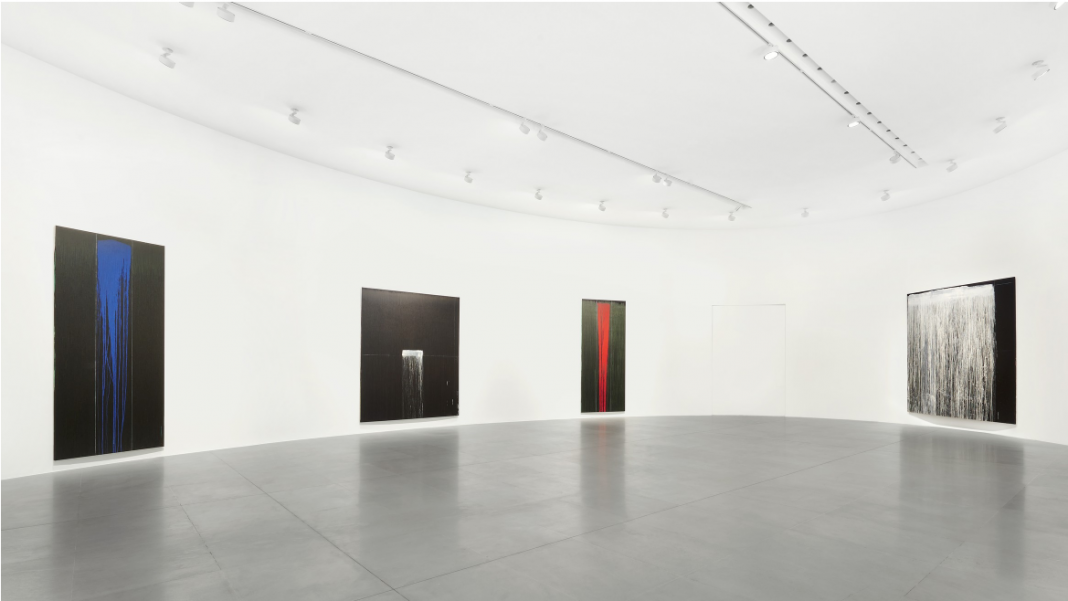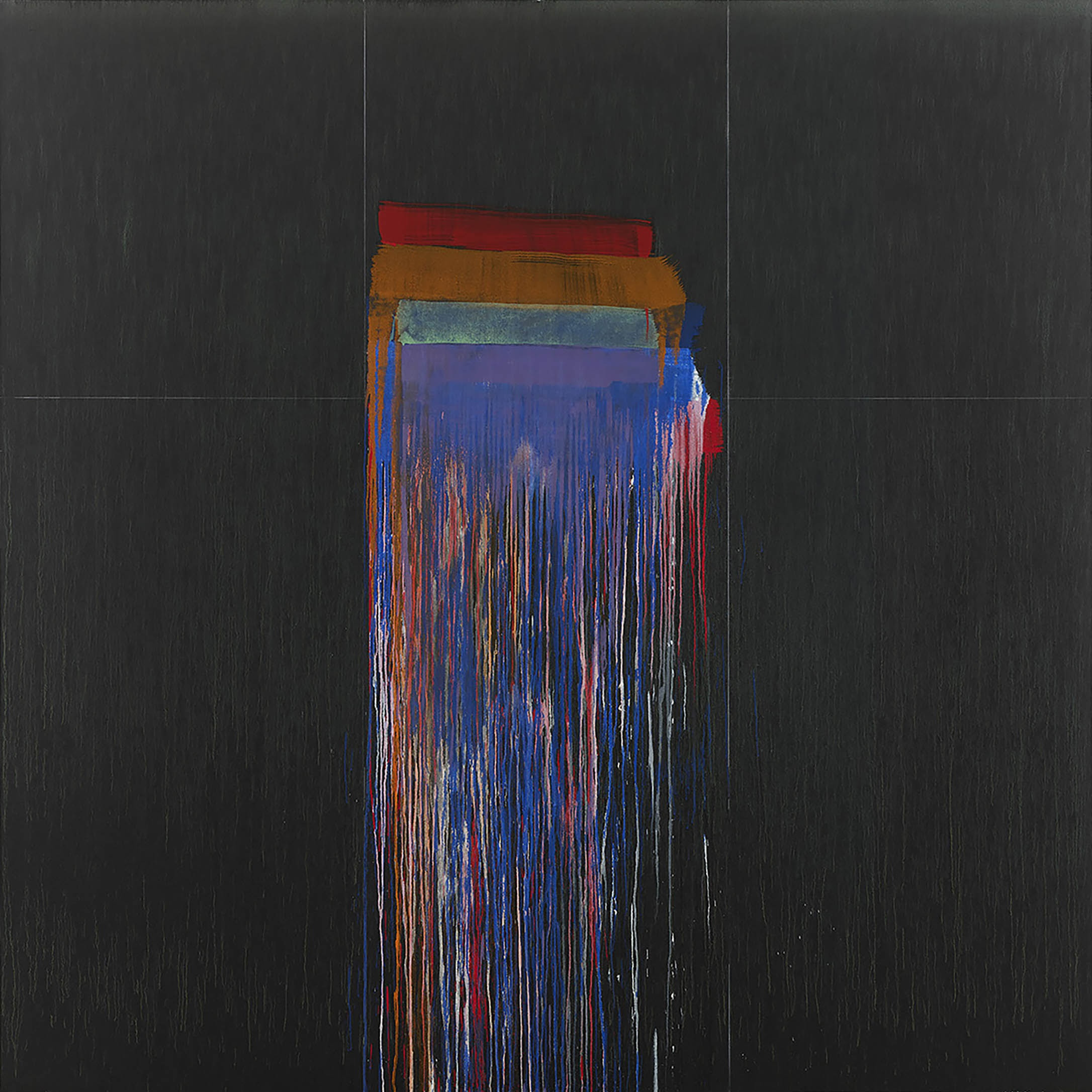 Liberando un flusso di vividi colori primari realizzati con unico gesto dal bordo superiore verso il centro della tela scura, l’artista esegue un’operazione compositiva casuale che unisce moderazione ascetica ed espressività spudorata. Questa tensione produttiva crea una risposta pittorica che, sebbene elegiaca, è carica di vita e delle sue contingenze.