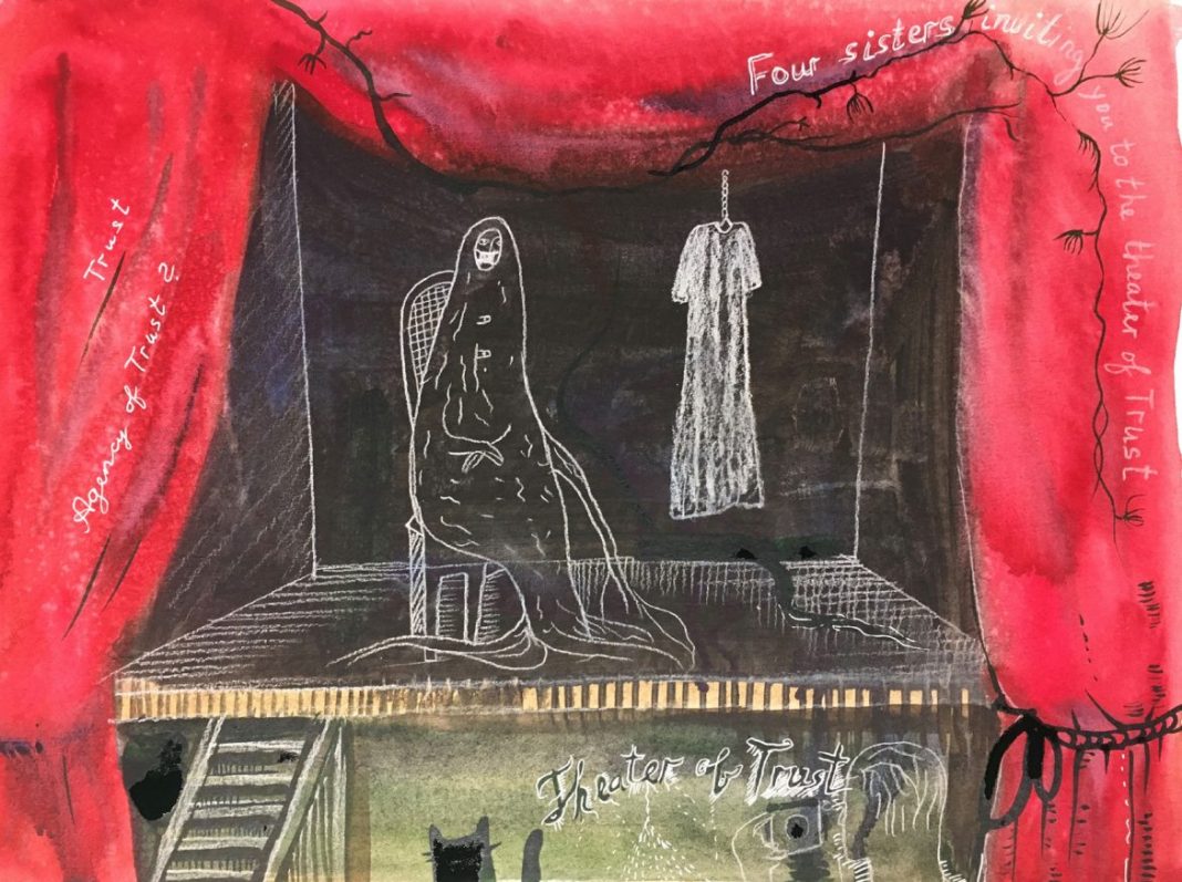 In altro modo, Gluklya le fa eco allestendo un teatro surrealista all’interno degli spazi espositivi, dove incontra persone di tutte le età ed estrazione sociale per parlare del tema della cura durante la pandemia, in un ambiente protetto, di fiducia e intimità. Da questi dialoghi nascono acquerelli e sculture rivestite da un tessuto nero semitrasparente, appese per i capelli al soffitto, che racchiudono, sotto una grande amigdala (la ghiandola che regola le emozioni), i feticci portati dai partecipanti. Queste opere, intitolate Vails of Sarrow and Hope e realizzate in collaborazione con la fashion designer Raja e gli studenti dell’Accademia di Belle Arti di Bologna, intendono sublimare il concetto di fragilità come forza invisibile, tanto sottovalutata quanto potente, e saranno “processate” con la performance Silence walk condotta da Glukya stessa durante la settimana di Arte Fiera per il finissage della mostra (sabato 14 maggio, dalle 19:00 alle 21:00).