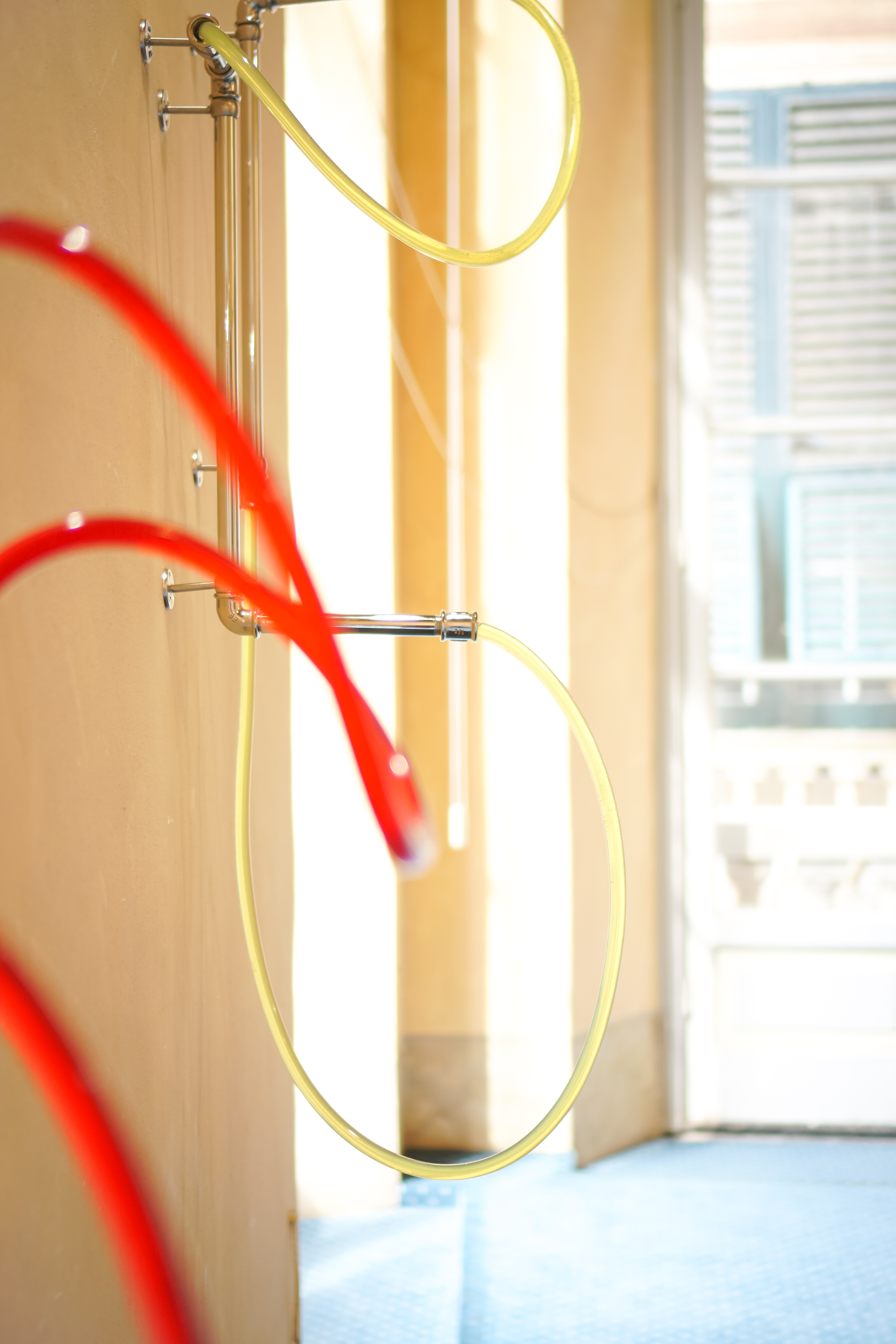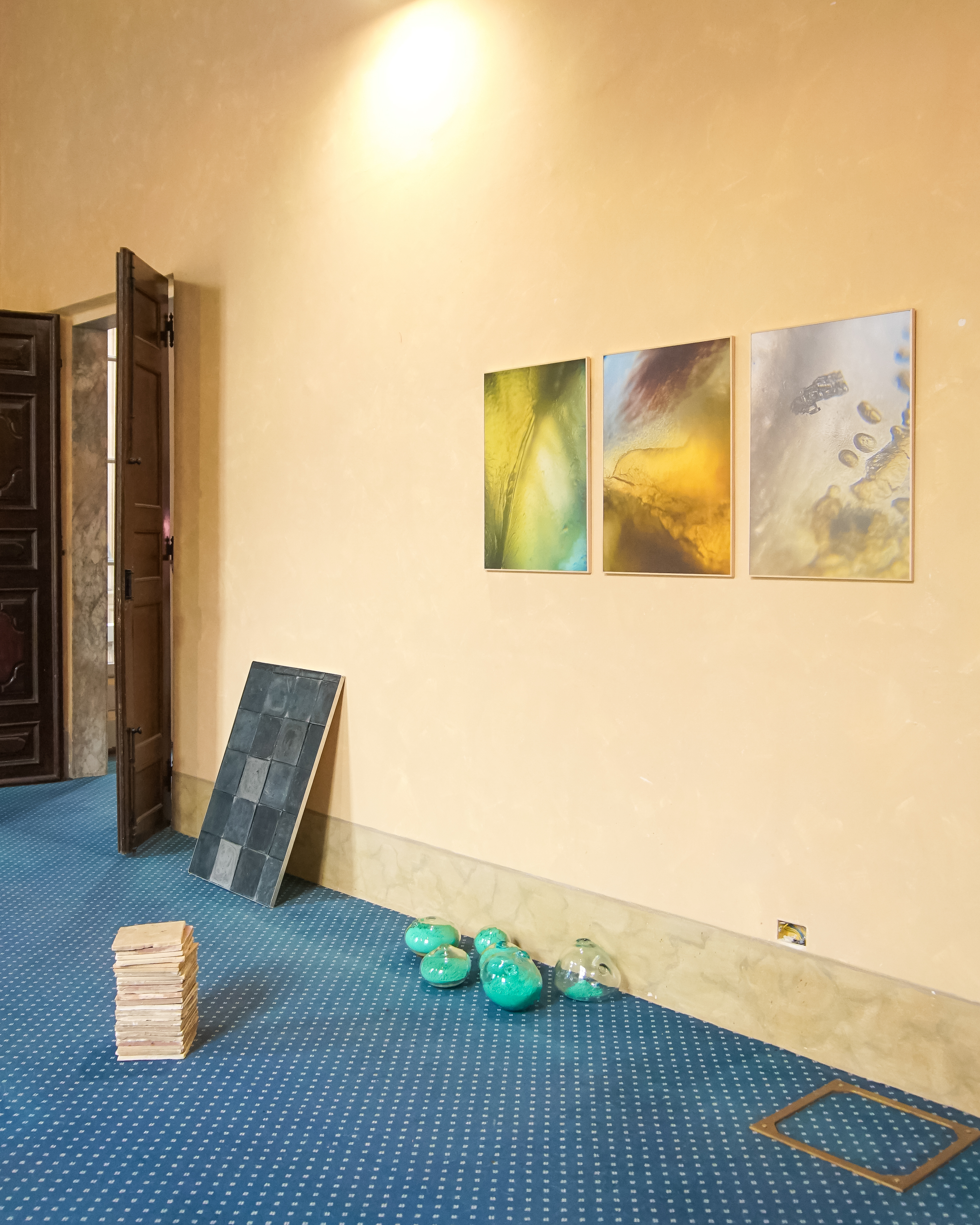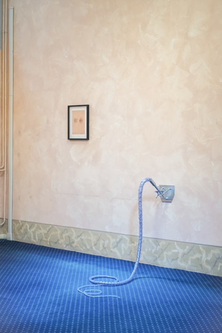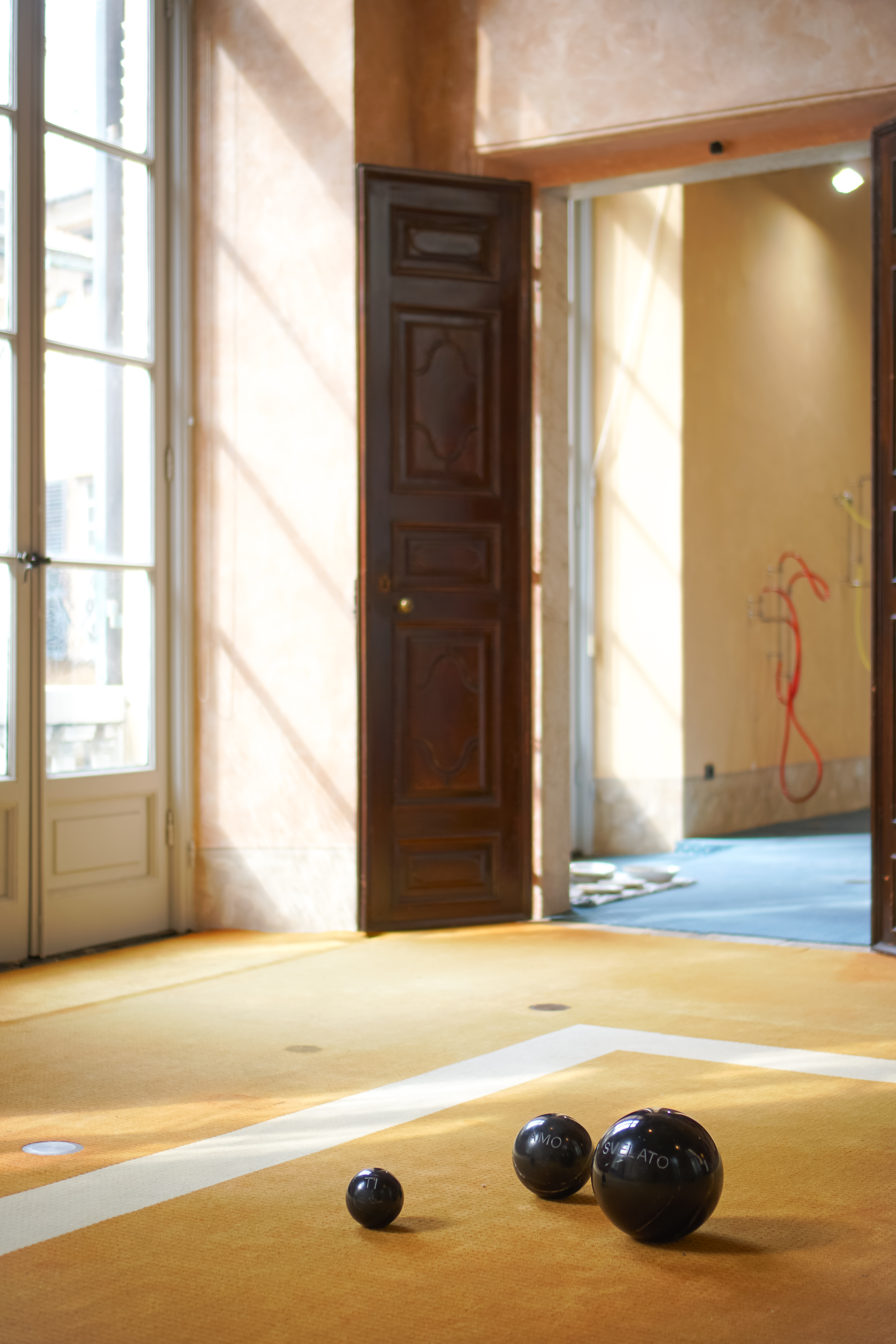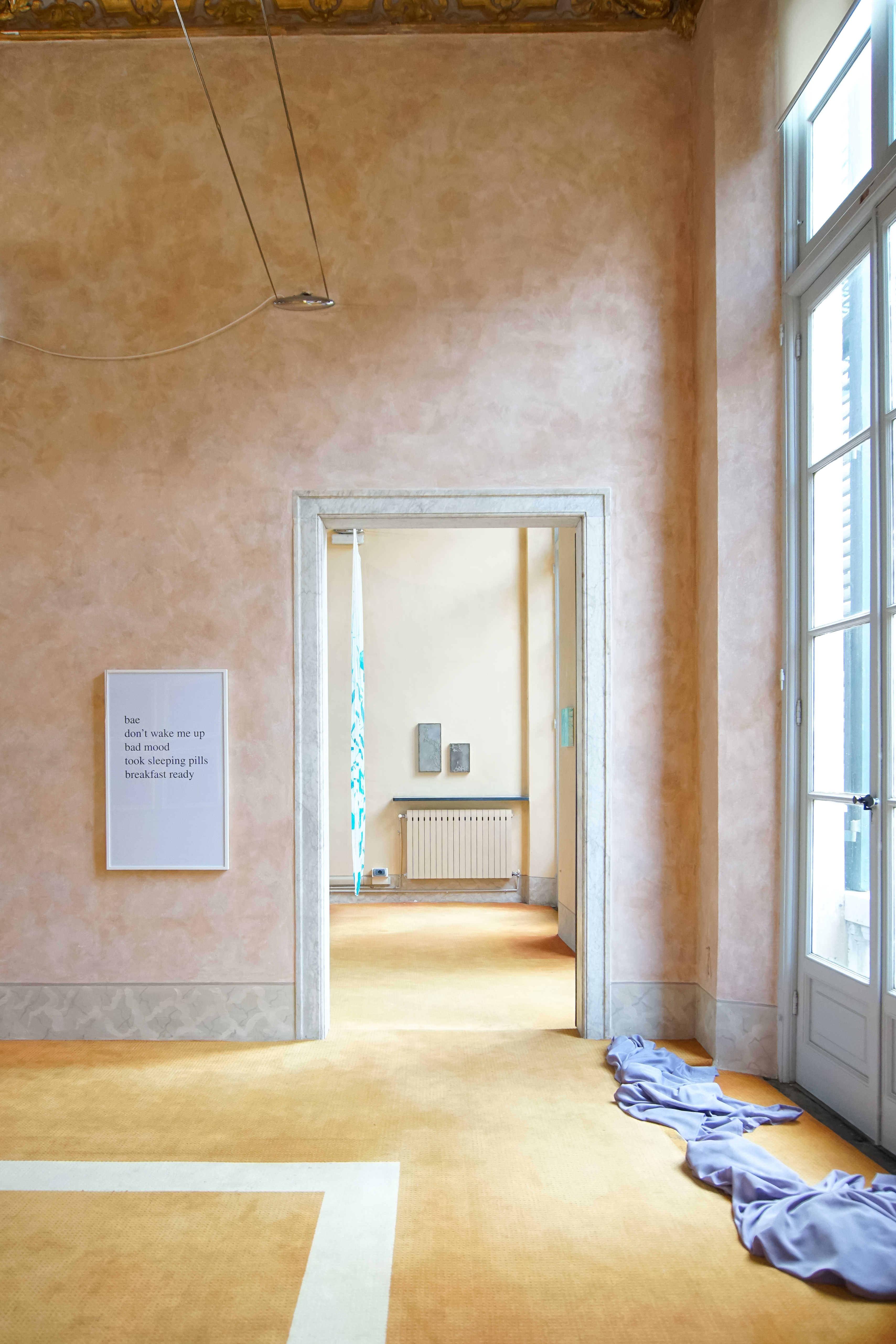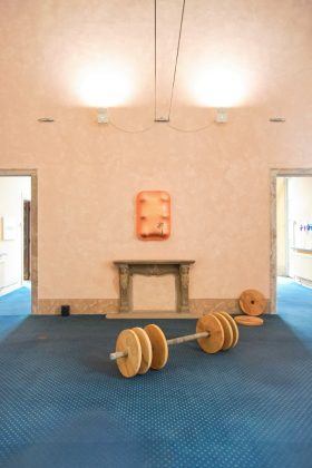 Contraltare di ogni rischio è una sicurezza di nome Flavia Albu. Colei che più spassionatamente di tutti prova a fondersi col luogo: una grossa tela, una pittura dalla gestualità fluttuante come il panno che pare caduto a terra dal nulla. Un’istallazione amabilmente “di maniera”, il fine pasto che ti aspetti in un menù che fin lì ti ha dato molte soddisfazioni. Fortuna sta subito di fronte, perché entrare nel salone maggiore, alzare anche solo per sbaglio gli occhi e vedere la volta azzurro spugnato fa orrore. Si, orrore. Forse non dovevamo, ma l’abbiamo detto.