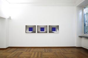 Si tratta di una fotografia di dimensioni più ridotte, creata da un gioco di luci blu (le altre che appaiono blu, nelle opere in mostra, sono in realtà negativi di immagini digitali). Vi si vedono due mani, in una posa che evoca esplicitamente quelle misteriose dei personaggi di alcune opere di Malevič degli anni trenta. Riconosciamo qui, così, un’altra figura del dissimile. Una piccola nota interessante, a completare il tutto: il testo della mostra è firmato da Gregorio Botta, artista a sua volta.