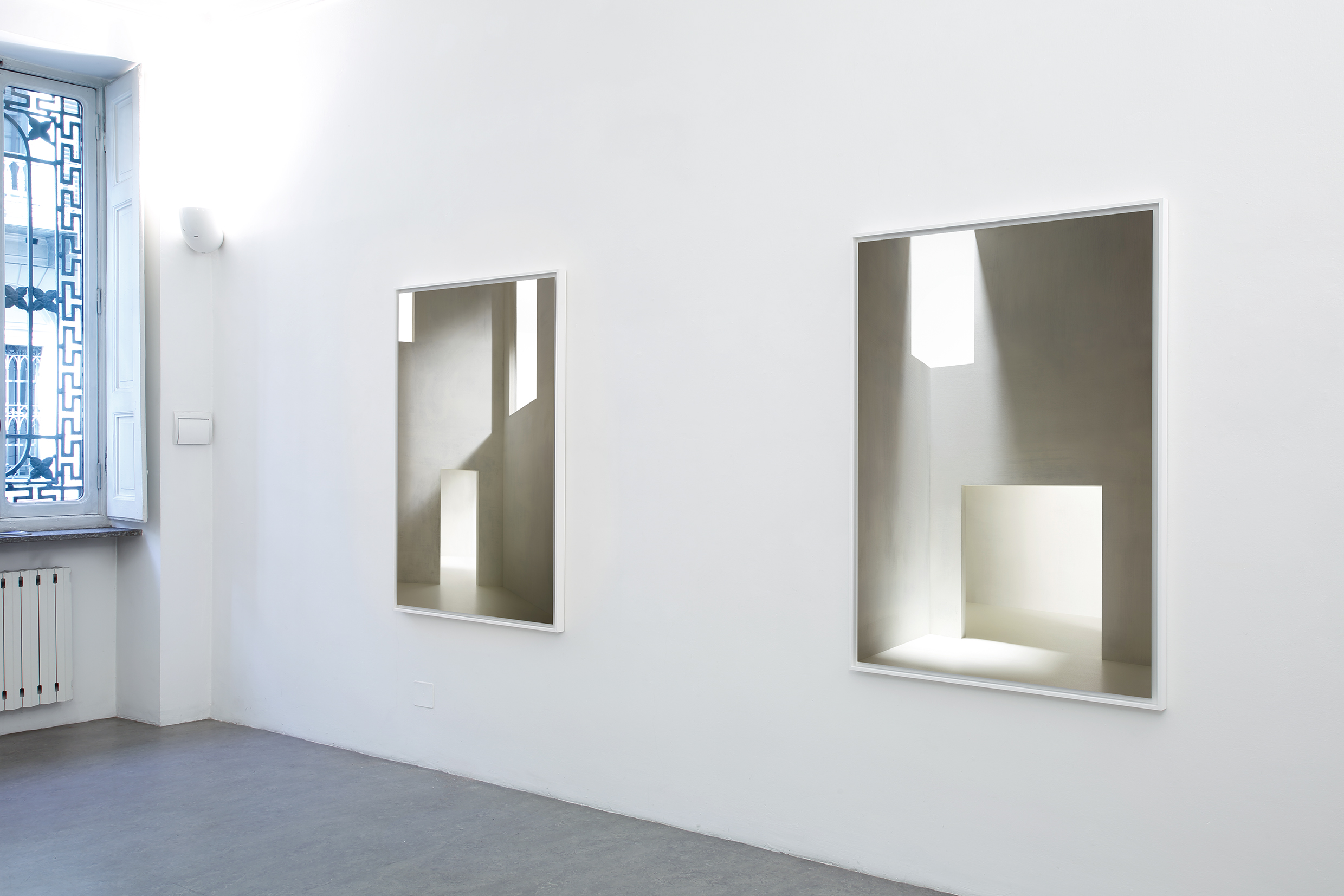 La mostra prosegue poi, da qui, in un alternarsi di immagini di luci e di spazi. Alcuni di questi sono spazi generati naturalmente dallo spontaneo vorticarsi delle conchiglie, qui riprodotte al negativo, ad esaltarne stranianti effetti di luce. Altri spazi sono invece ricreati in studio ricorrendo a modellini, che ingannano i sensi ed evocano celle di monasteri dalle atmosfere metafisiche. Qui il ritmo di luci ed ombre, porte e finestre, disegna luoghi prima di tutto mentali. Si noti che tutto è accuratissima fotografia, anche dove, a un primo sguardo, quasi sembra pittura.