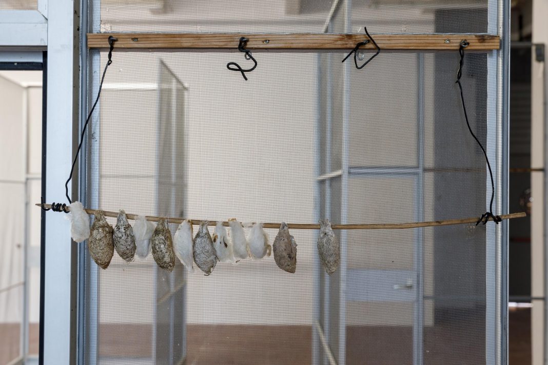 Nel 2022, questi lepidotteri trovano dimora nello spazio dell’esposizione. Adagiati ai pannelli della struttura rilocata, bozzoli di Argema Mimosae si accompagnano alle proprie microfusioni in argento. Come già in Senza titolo (2016), dove un ramo di legno combusto era disposto specularmente al suo doppio in bronzo, la collocazione delle crisalidi di falena accanto a loro individui adulti rappresenta un passaggio di stato figurato: la trasmutazione alchemica della materia nel processo artistico.