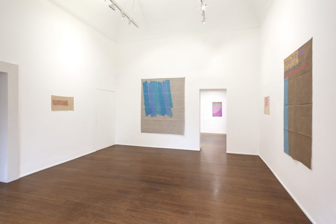 Se prendiamo per buono quanto detto fin’ora, partire con Tre segni del ’79 (dalla serie Contaminazioni) è come dare un indice introduttivo alla qualità ipertestuale del lavoro di Griffa, in una personale dove ogni opera assume i connotati della pagina-pop up. E qui fa il suo la compiacente mise en place di tele – juta e cotone – sottili e fluttuanti come fogli, appena spillate solo nella parte superiore. Ma non basta.