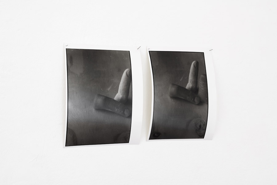 Messi a tacere i primi frulli in testa proseguo con il resto della galleria. Scrivevo sopra che ci sono alcune mani sparse in giro, e insieme, anche fotografie di mani, ma poste su un tavolo. Dentro e fuori la fotografia le mani sono in cera e in gesso. Sembrano tentativi mal riusciti di fare mani. Nessuna di queste è una copia, dunque, non ce n’è una identica all’altra. Ci sono anche dita. Quarto, quinto dito, mezzo dito. Mani ‘vere’ e mani ‘finte’. Persino mani a sei dita!