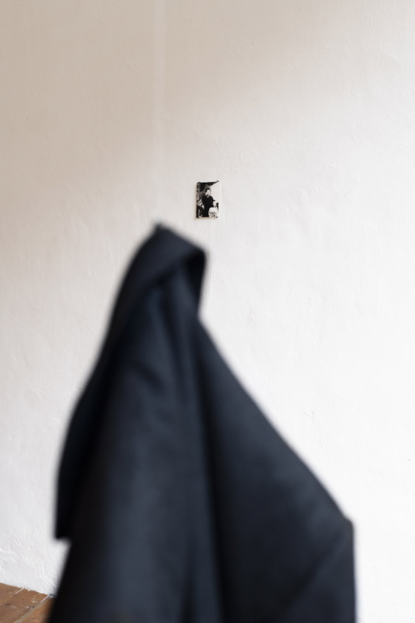Al primo piede in galleria lo sguardo è dritto verso alcuni abiti appesi. Sono piuttosto evidenti, che subito saltano all’occhio. E ci sarebbe anche da aspettarselo in effetti: quella loro immobilità è in realtà il sospetto che da un momento all’altro potrebbero penzolare, girare, all’improvviso animarsi in qualche modo. Inoltre, quel loro numero, un gruppo da sei o sette abiti scuri, fa come una adunata. «Si muoveranno a un tratto e si metteranno tutti uno accanto all’altro, militarmente in fila, per essere indossati di nuovo», immagino. Convergendo al centro della galleria, a guardare più da vicino, quegli abiti sono giacche e cappotti. Sono in buono stato e la taglia sembra essere quella di un uomo di media statura. Ora che ci passo sotto, mi appaiono più come “scacciaspiriti”. Tuttavia, perché fatti di stoffa, sono incapaci di fare rumore, avvisare della venuta di qualcuno, persino di scacciarlo. Banalmente mi ricordo di Gogol e di quel cappotto che ragionava, e ostinato, se ne andava in giro per la città.