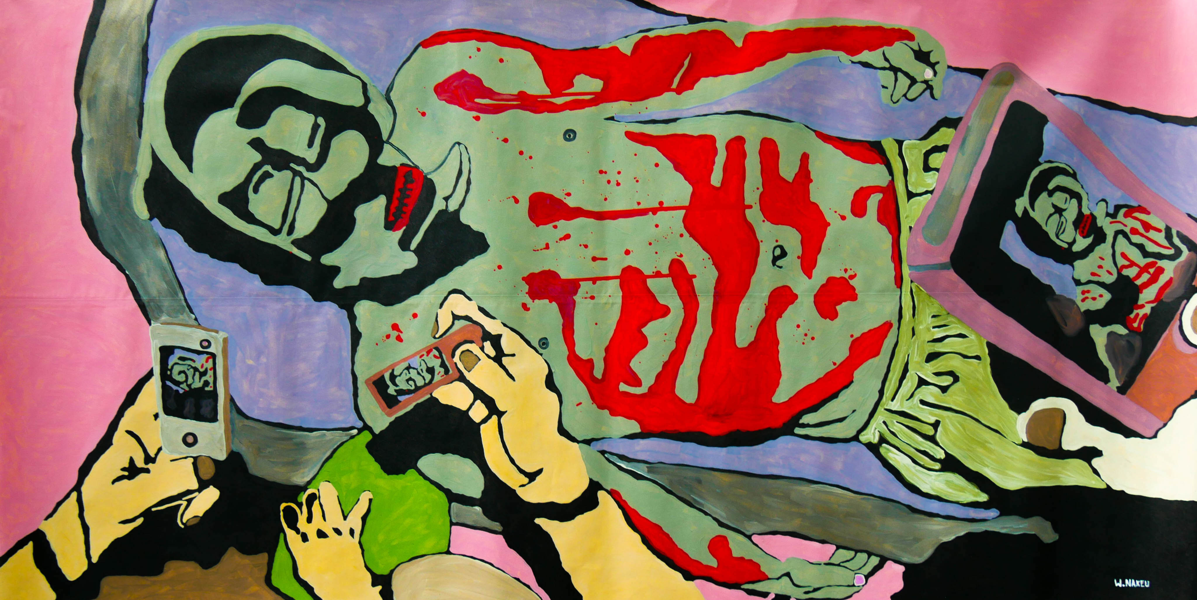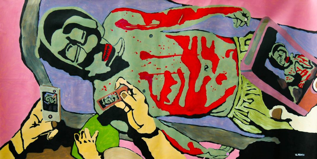 A Game of War: Kambalu v Sanguinetti Trial at Ostend (2021) di Samson Kambalu (1975, Malawi), è un’installazione il cui video di due ore e dieci presenta una versione ironica del processo dell’artista stesso, accusato di violazione dei diritti d’autore da Gianfranco Sanguinetti. Siamo nel 2015 alla Biennale d’arte di Venezia quando l’artista malawiano, sulla scia dei principi dell’Internazionale Situazionista, espone delle fotografie, da lui stesso scattate, dei documenti degli archivi di Sanguinettii. I situazionisti, a cui Gianfranco Sanguinetti apparteneva insieme a Guy Debord, professavano la libera riproduzione delle opere e vedevano nel détournement il riscatto della pratica artistica dai dispotici diktat culturali. Alla fine Kambalu viene assolto da ogni accusa poiché la sua opera, giudicata originale, non violava di fatto i diritti d’autore. L’installazione è inoltre arricchita da graffiti provocatori che guardano alle regole del War Game ideato da Debord. Il video, del falso processo, è accessibile gratuitamente online. L’artista multimediale, Wilfried Nakeu (1990, Camerun) porta qui Reconnexion spirituelle des politiques africaines (2022), un video di 9 minuti battuto all’asta come NFT. Di questo oggetto ne decostruisce il principio fondatore, cioè l’insieme di dati memorizzati sulla blockchain, che diventano oggetti rituali vudù. Un NFT afro-futurista dunque, che testimonia come l’era digitale abbia fluidificato gli scambi di idee e il mescolarsi di culture diverse. Espone lo stesso Mo Laudi con Rest-itution (Renaming a collection). Who owns the past owns the future (2022), un’installazione effimera che corrobora l’attuale dibattito sulla provenienza delle opere africane presenti nei musei occidentali.