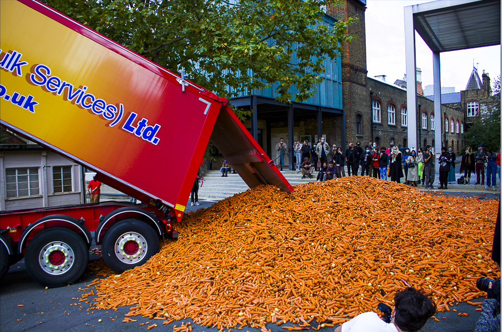 A Londra, un artista scarica in strada 29 tonnellate di carote per una performance